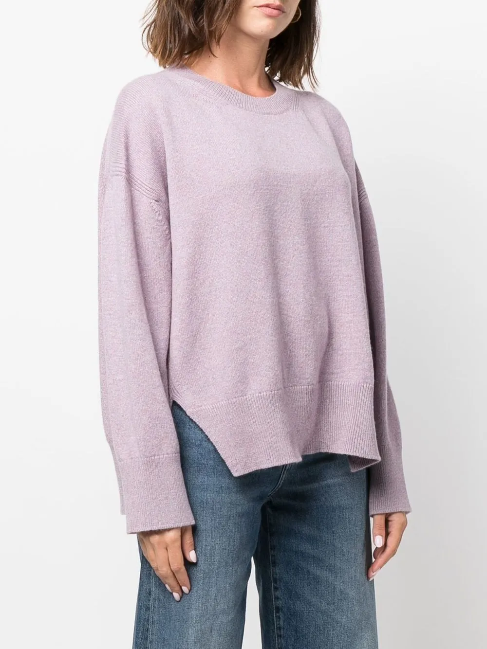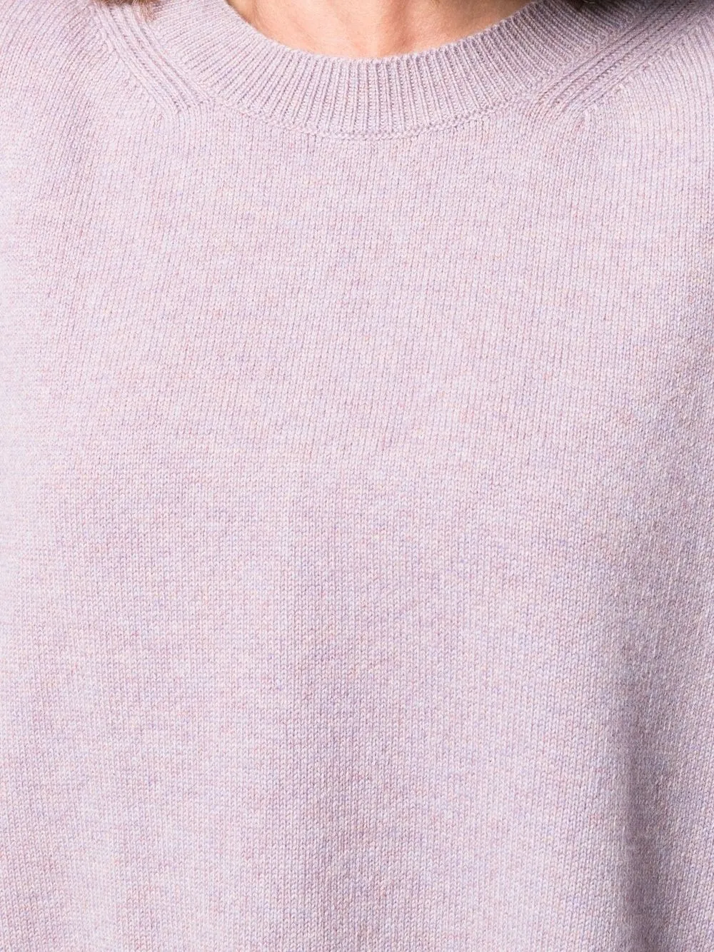 Фиолетовый, кашемир, круглый вырез, приспущенные плечи, длинные рукава, подол в рубчик и боковые разрезы.