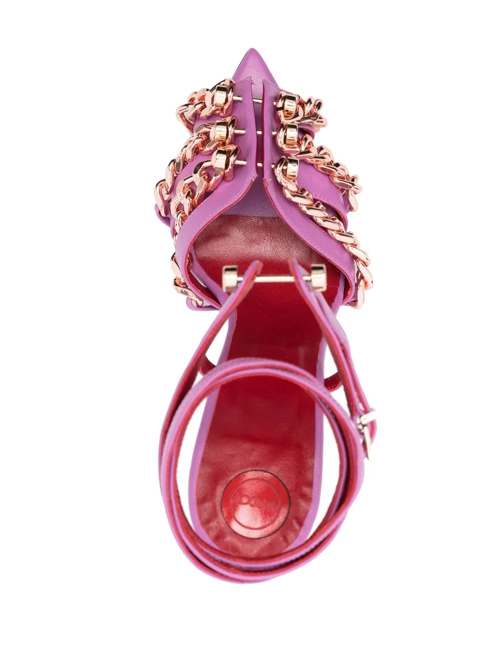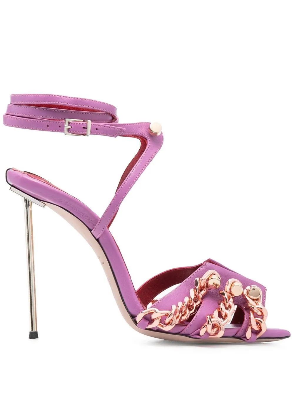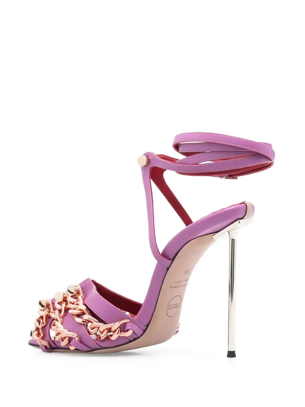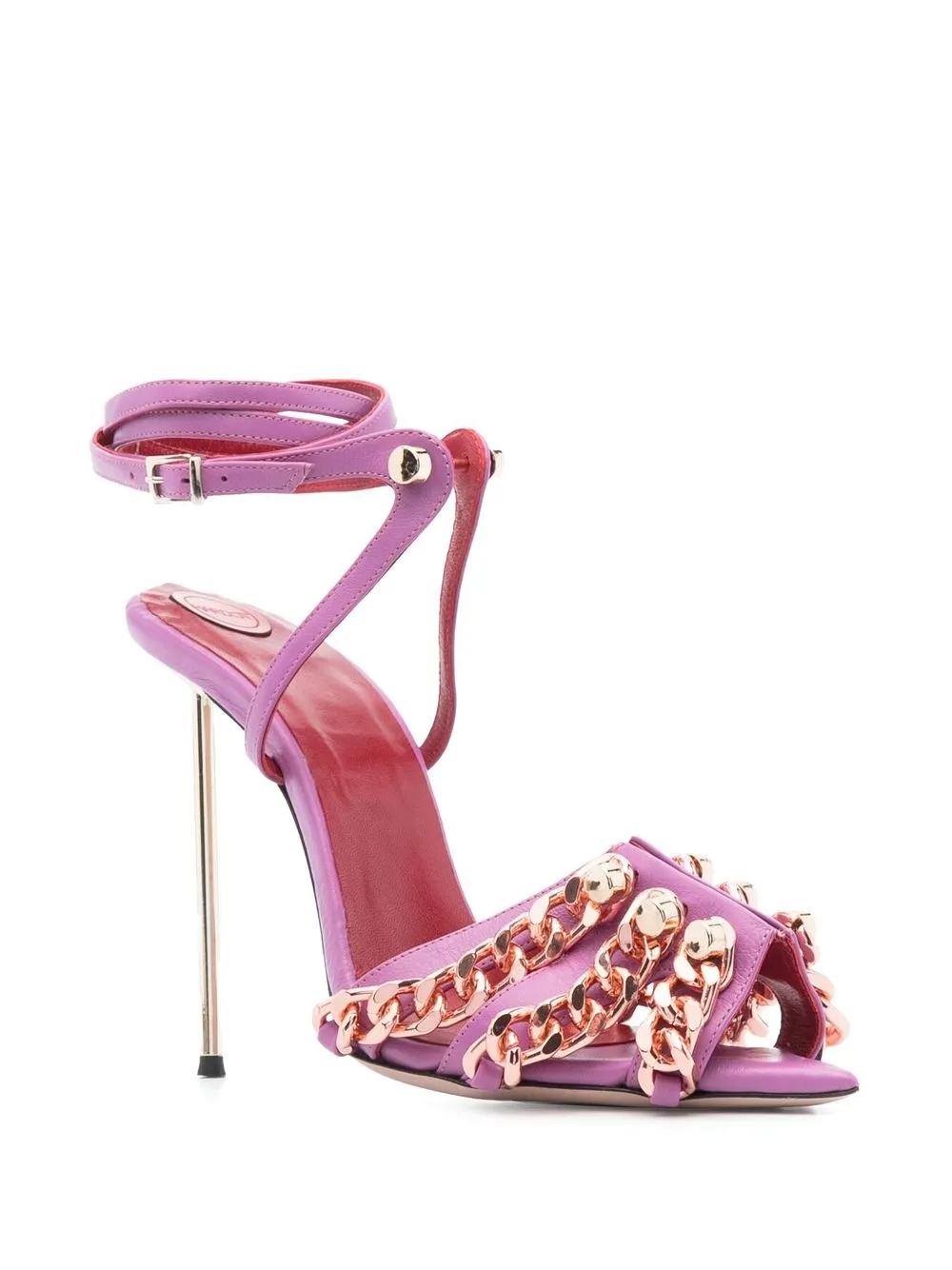 Фиолетовый, телячья кожа, цепочка, кожаная стелька с логотипом, открытый носок, ремешок на щиколотке с пряжкой и высокий каблук.