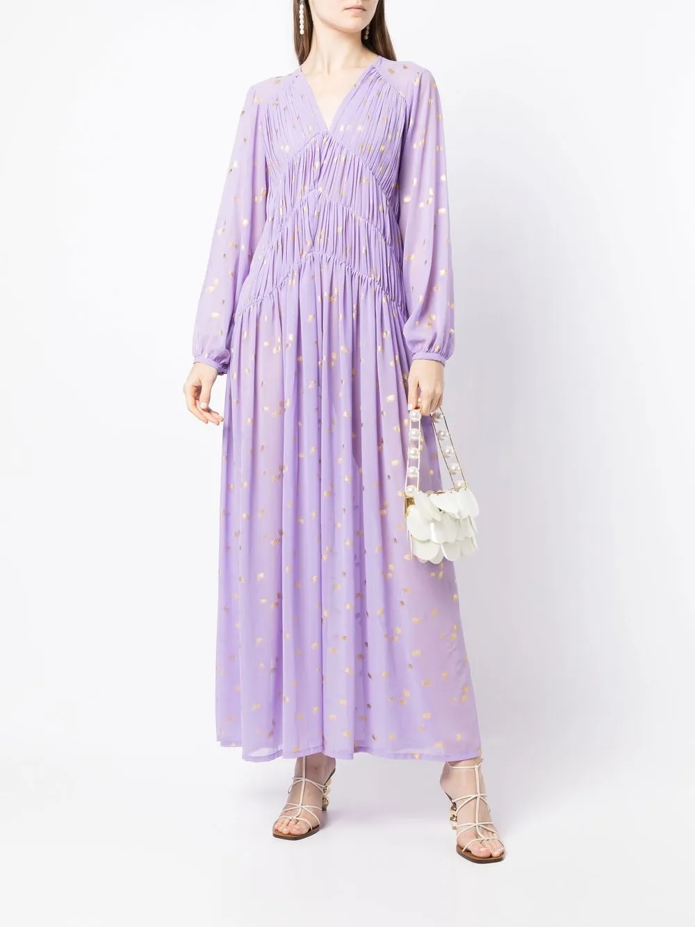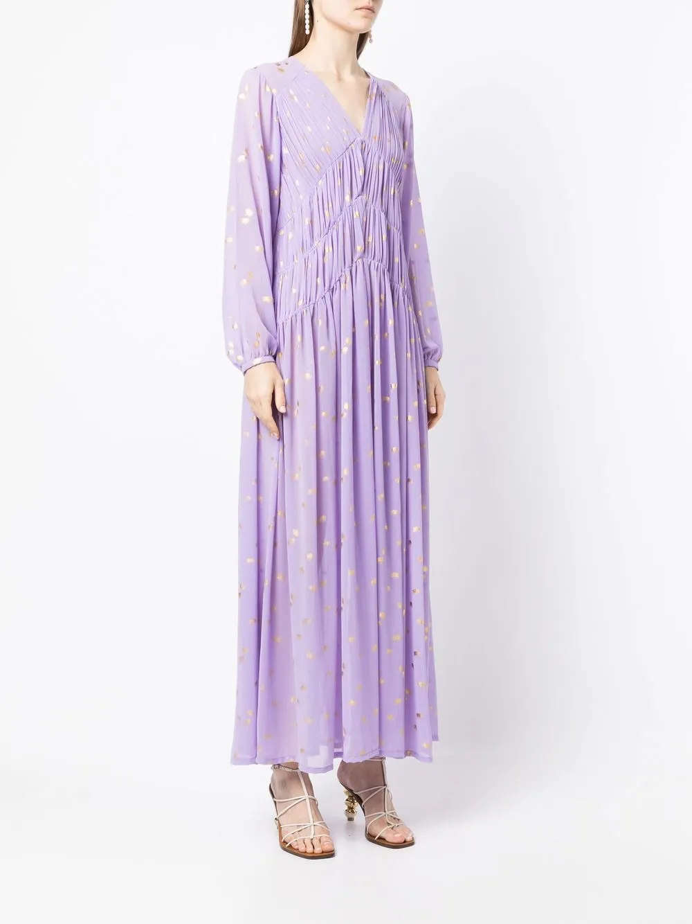 Лиловый, золотистый, принт в горох, складки, V-образный вырез, застежка на молнии сзади, длинные рукава и длинная модель.