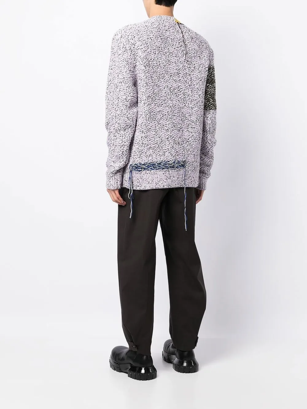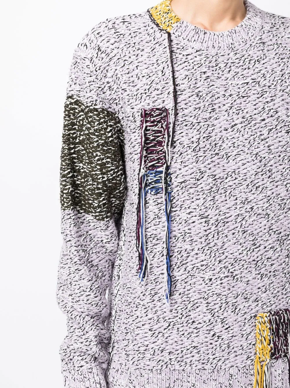 Светло-фиолетовый, разноцветный, смесь шерсти и хлопка, меланжевая пряжа, бахрома, контрастная строчка, края в рубчик, круглый вырез, длинные рукава и прямой подол.