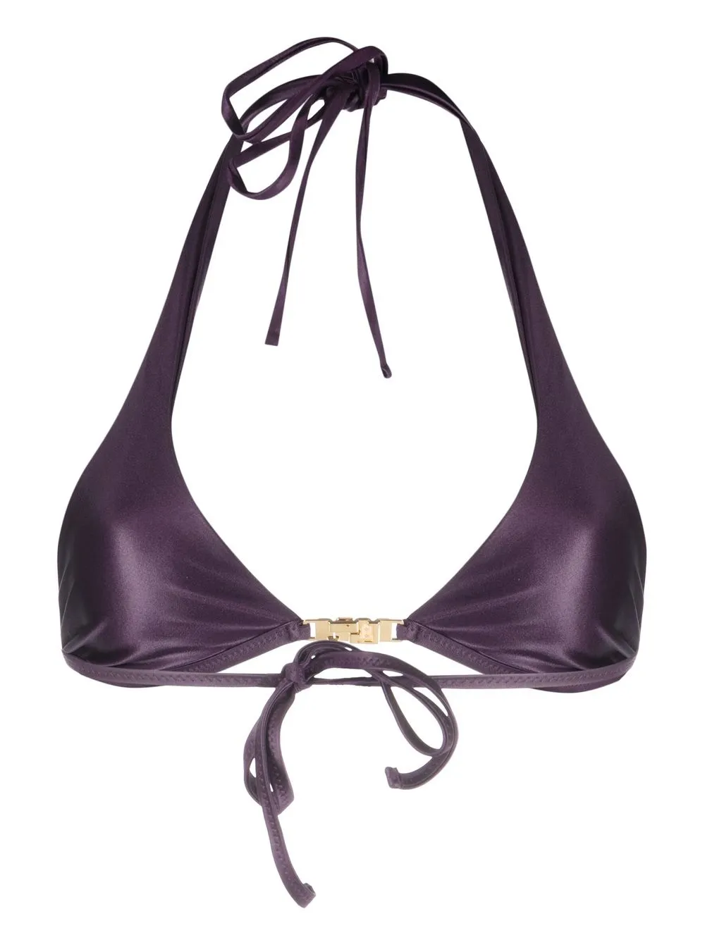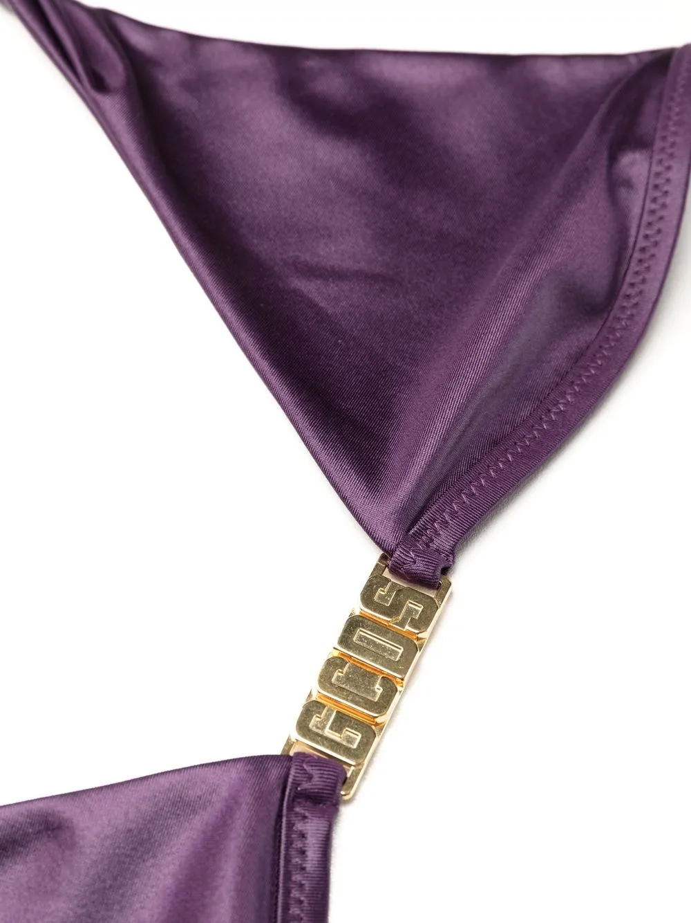 Фиолетовый, эластичный материал, эффект металлик, золотистый металлический логотип, завязки вокруг шеи, застежка на завязке сзади и треугольная чашка.