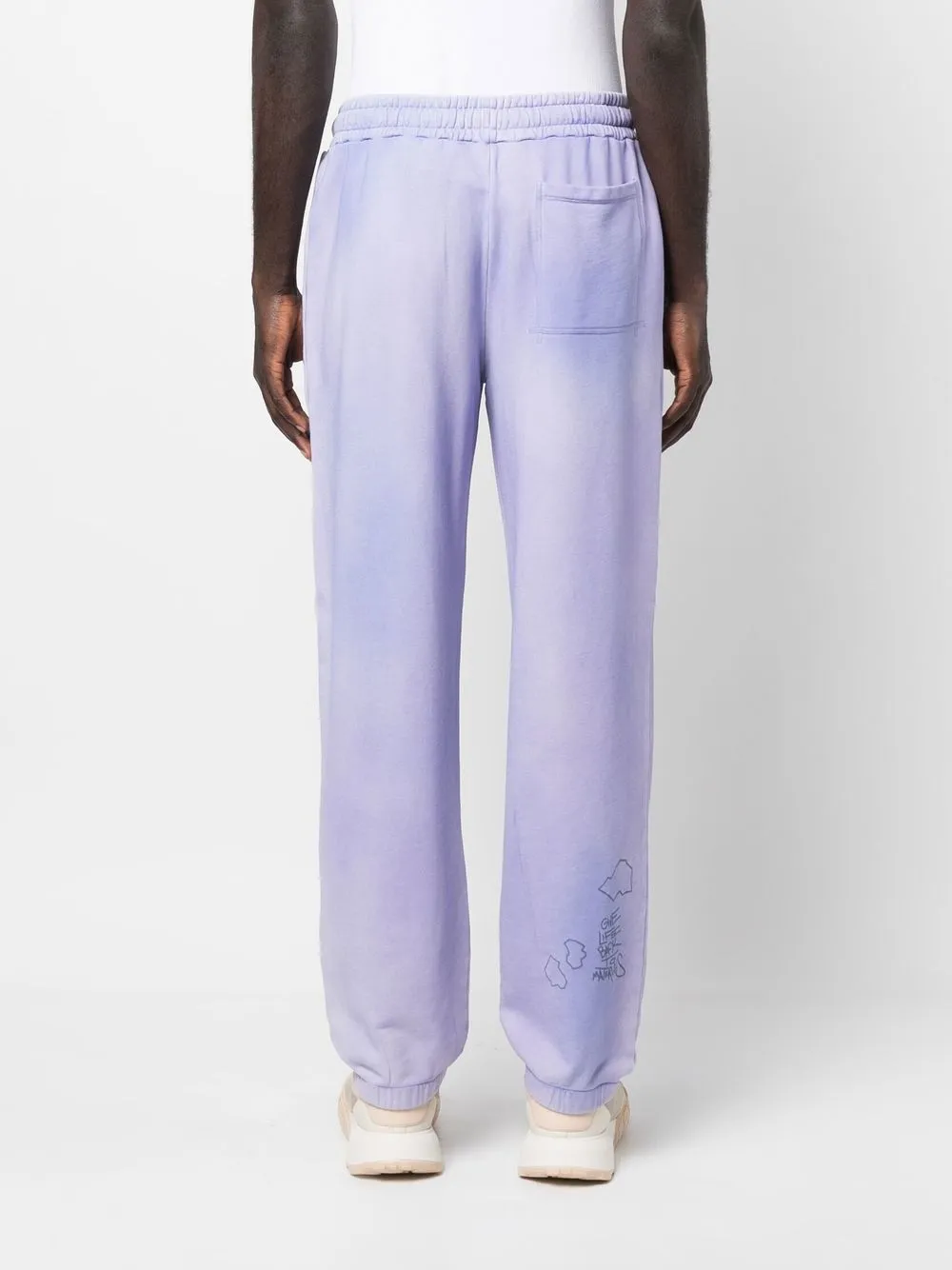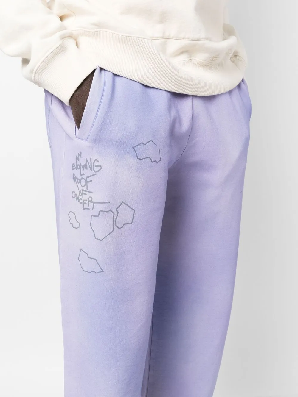 Сирень, органический хлопок, принт с надписью, эффект потертости, кулиска на талии, два прорезных кармана сбоку, накладной карман сзади и эластичные манжеты. Ответственный выбор: