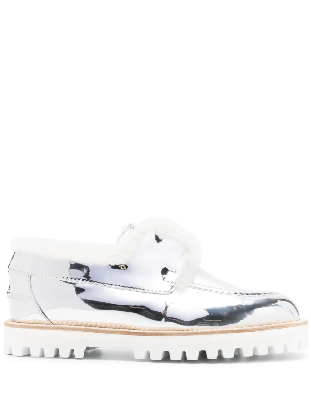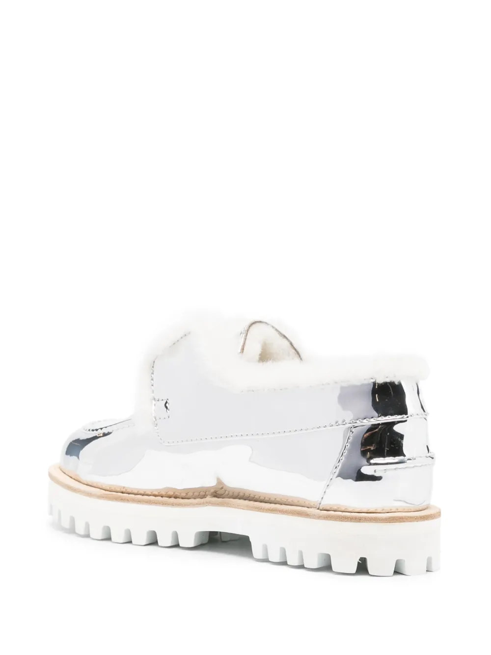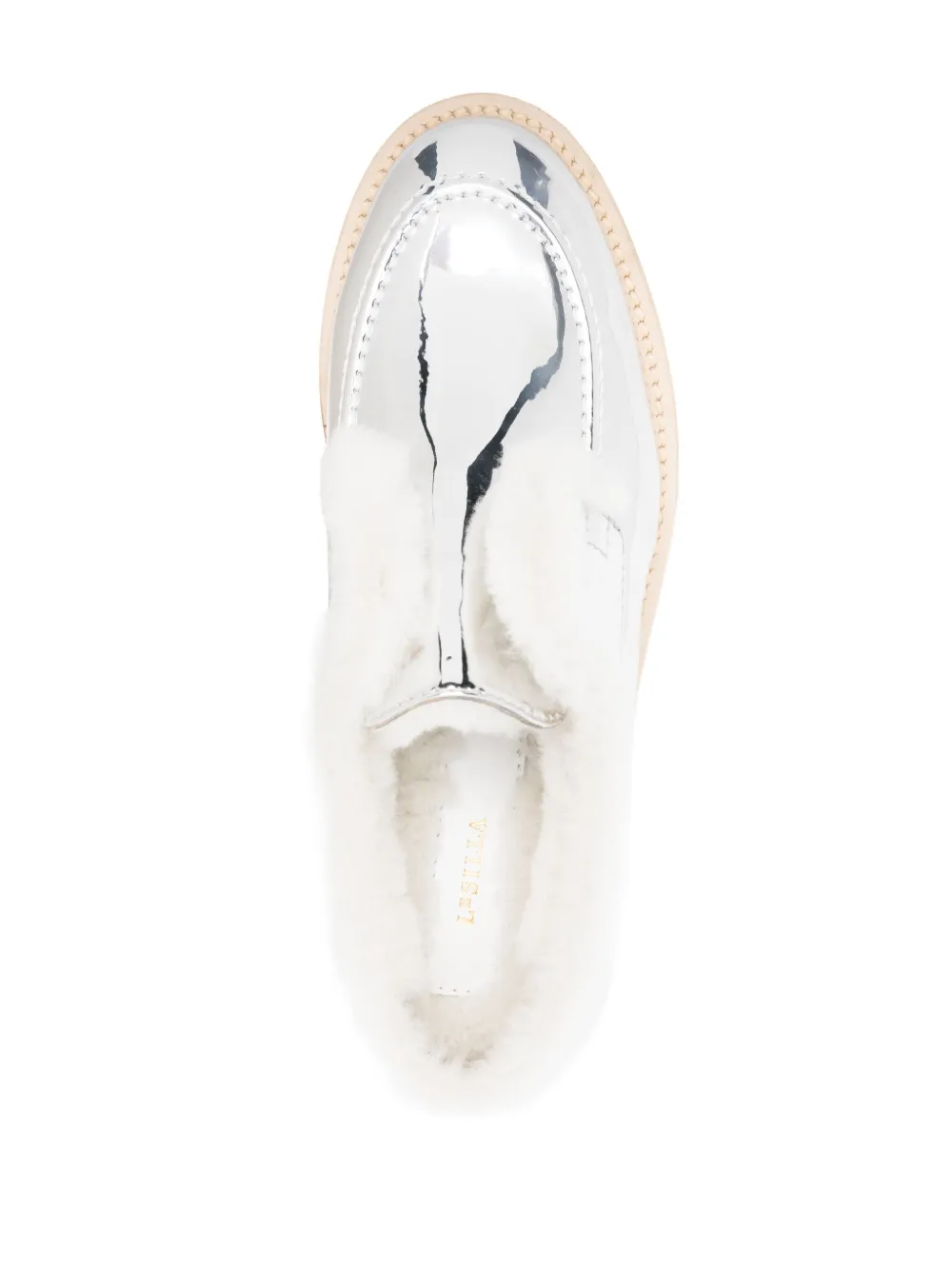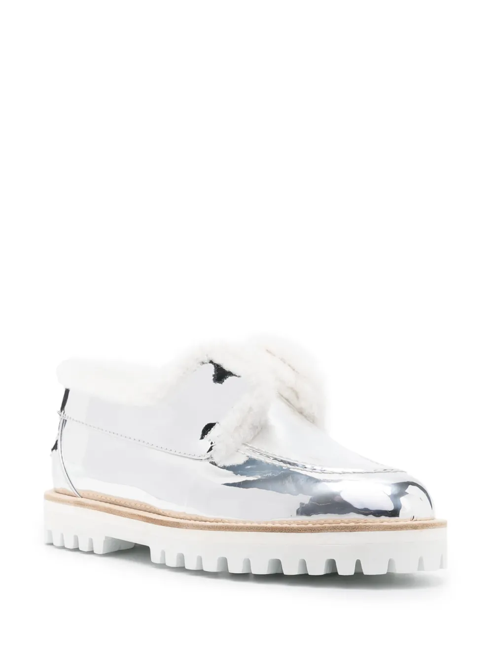 Серебристый, козья кожа, покрытие с эффектом металлик, овчина, закругленный носок, модель без застежки, стелька с логотипом и рифленая резиновая подошва.
