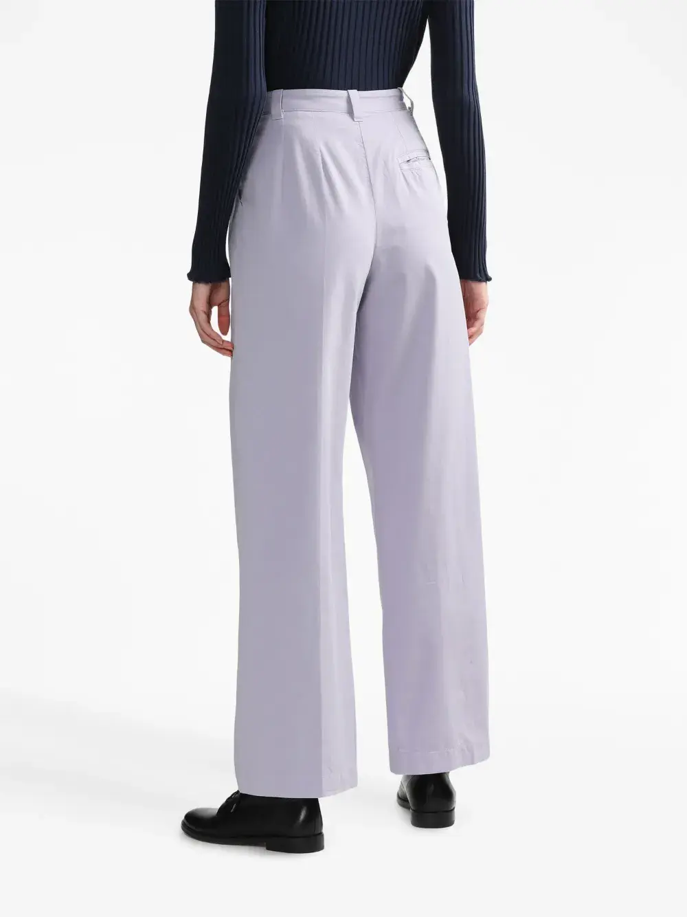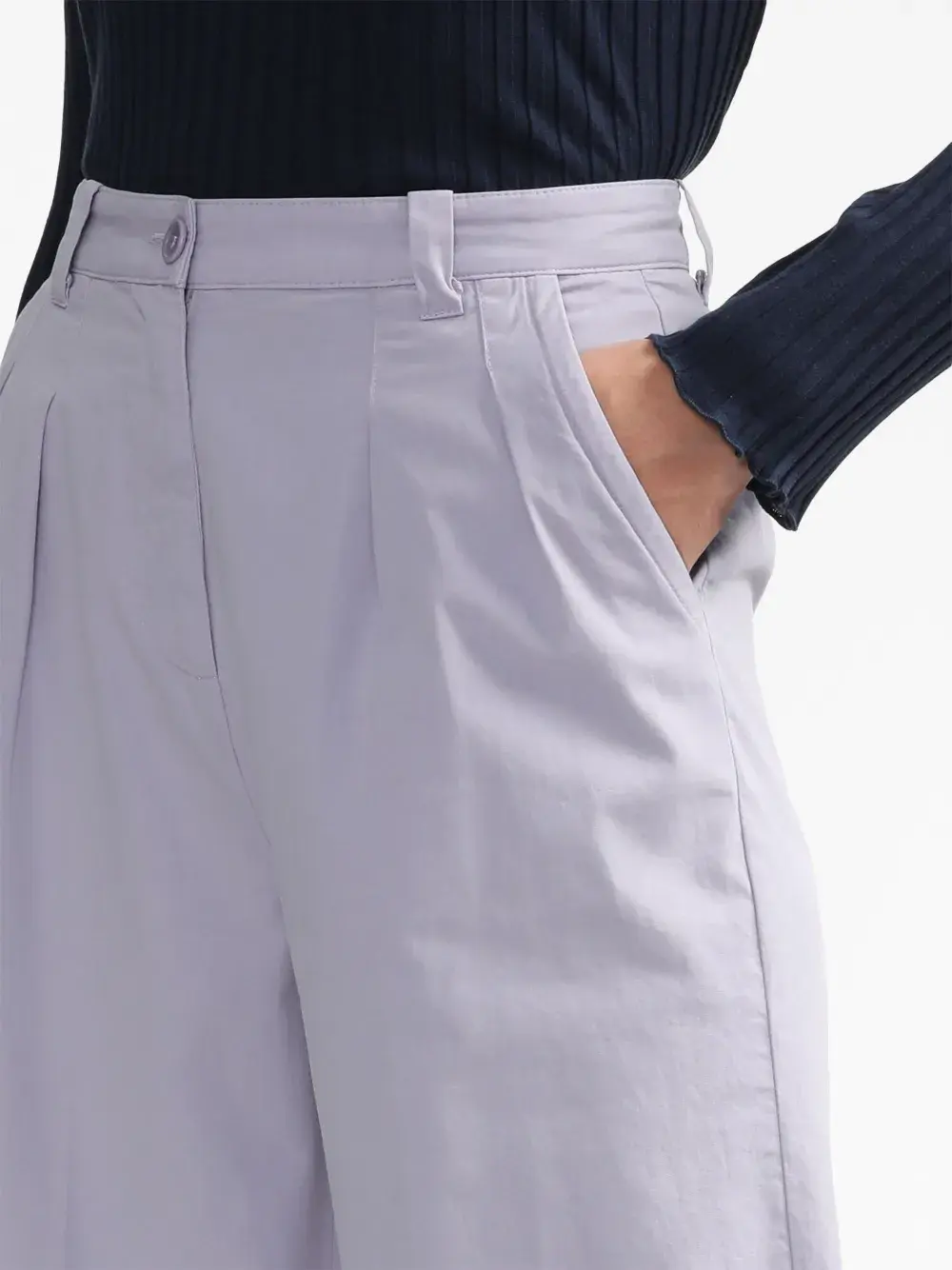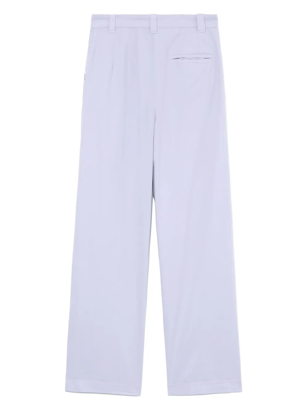 Лиловый, хлопок, петли для ремня, застежка на пуговицах спереди, складки, два вшитых кармана по бокам, прорезной карман сзади и прямой крой.
