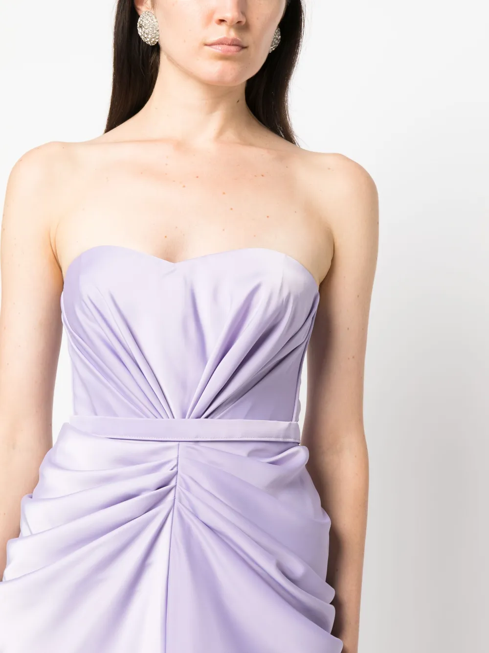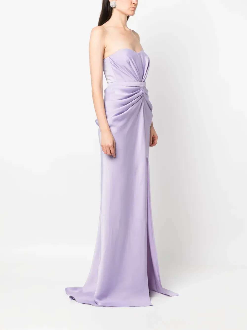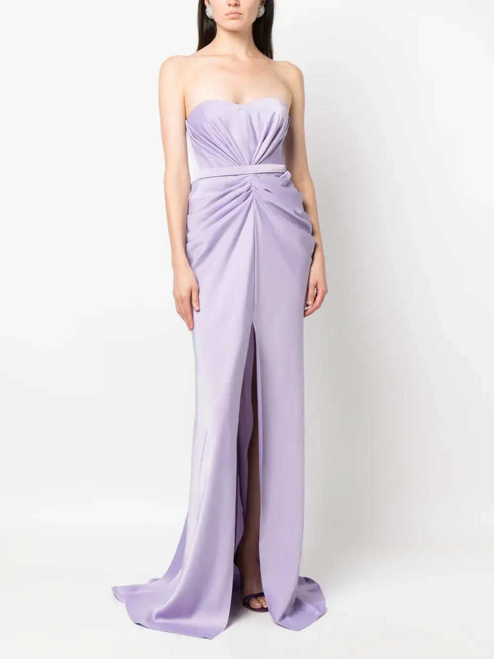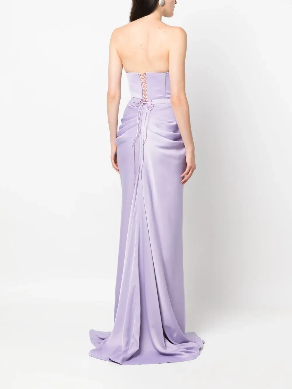 Фиолетовый, детали с оборками, драпировка, без бретелей, разрез спереди, застежка на завязке сзади и длинная модель.