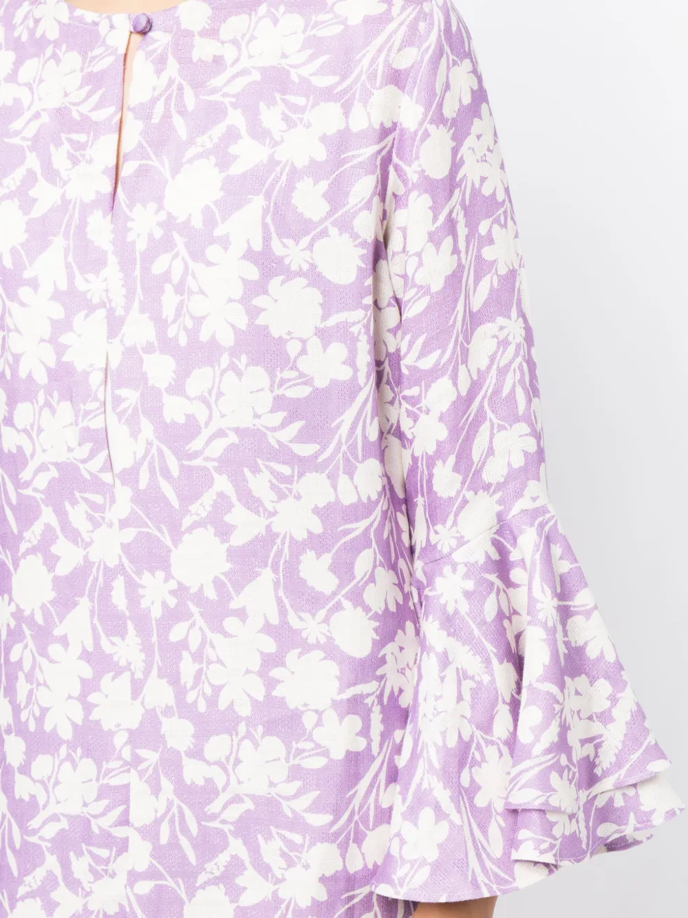 Фиолетовый, сплошной цветочный принт, вырез с прорезью, длинные рукава, манжеты с оборками, силуэт трапеция и длинная модель.