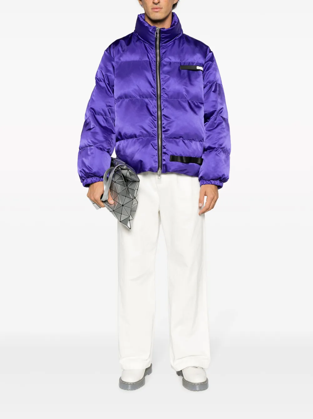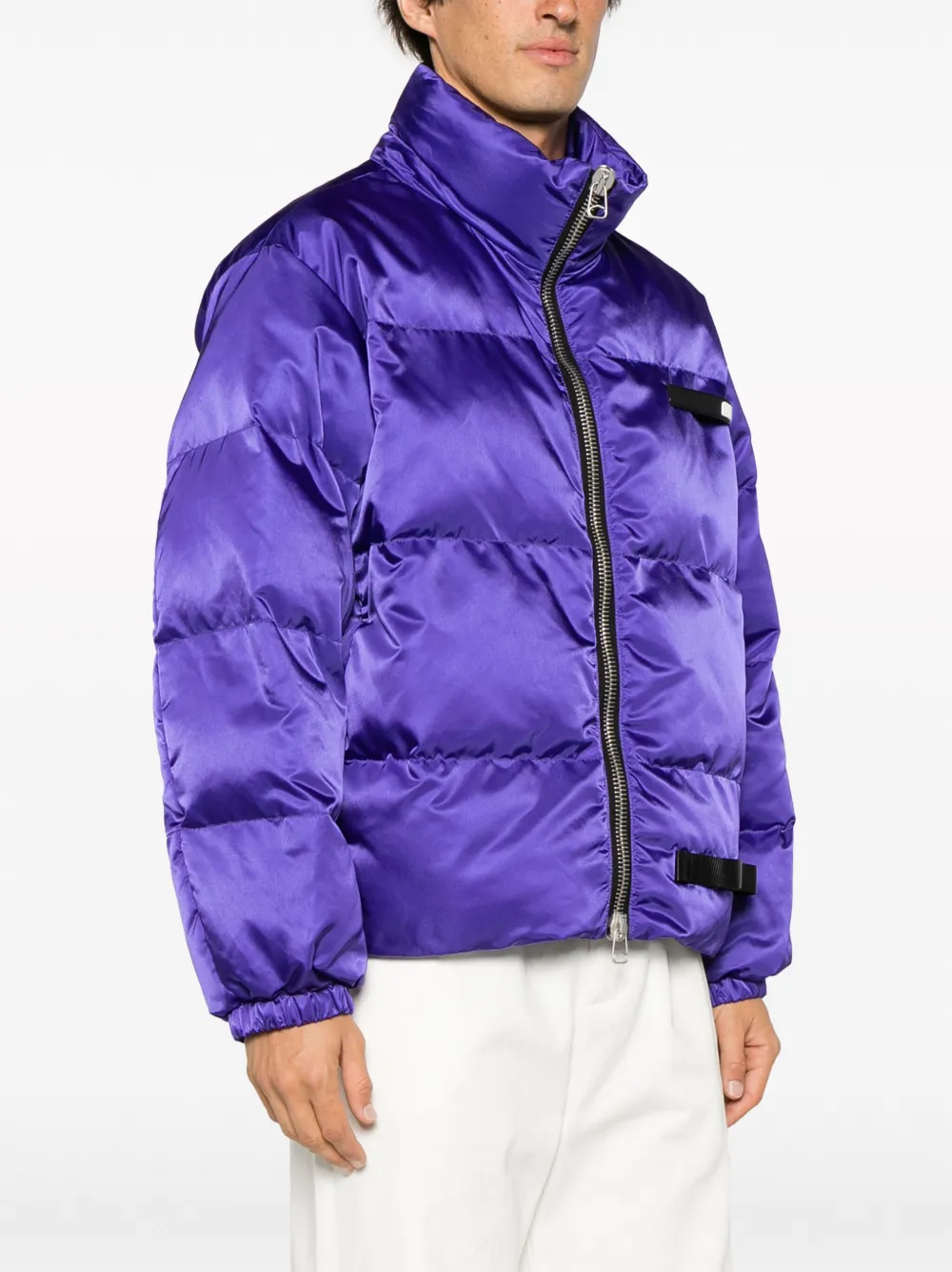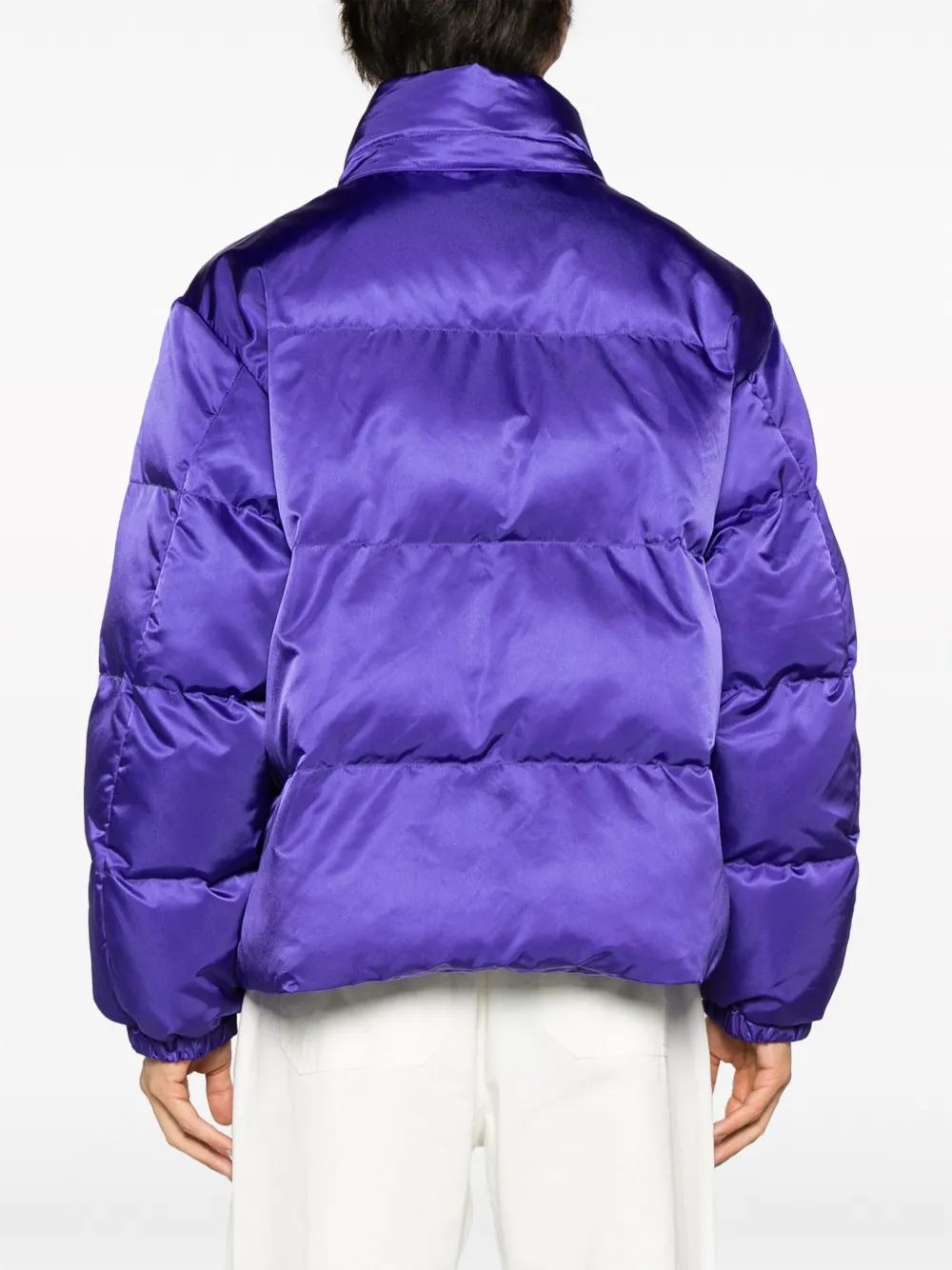 Насыщенно-фиолетовый, переработанный полиэстер, дутый материал, нашивка с логотипом на груди, воротник-труба, двусторонняя молния спереди, длинные рукава, эластичные манжеты и прямой подол.