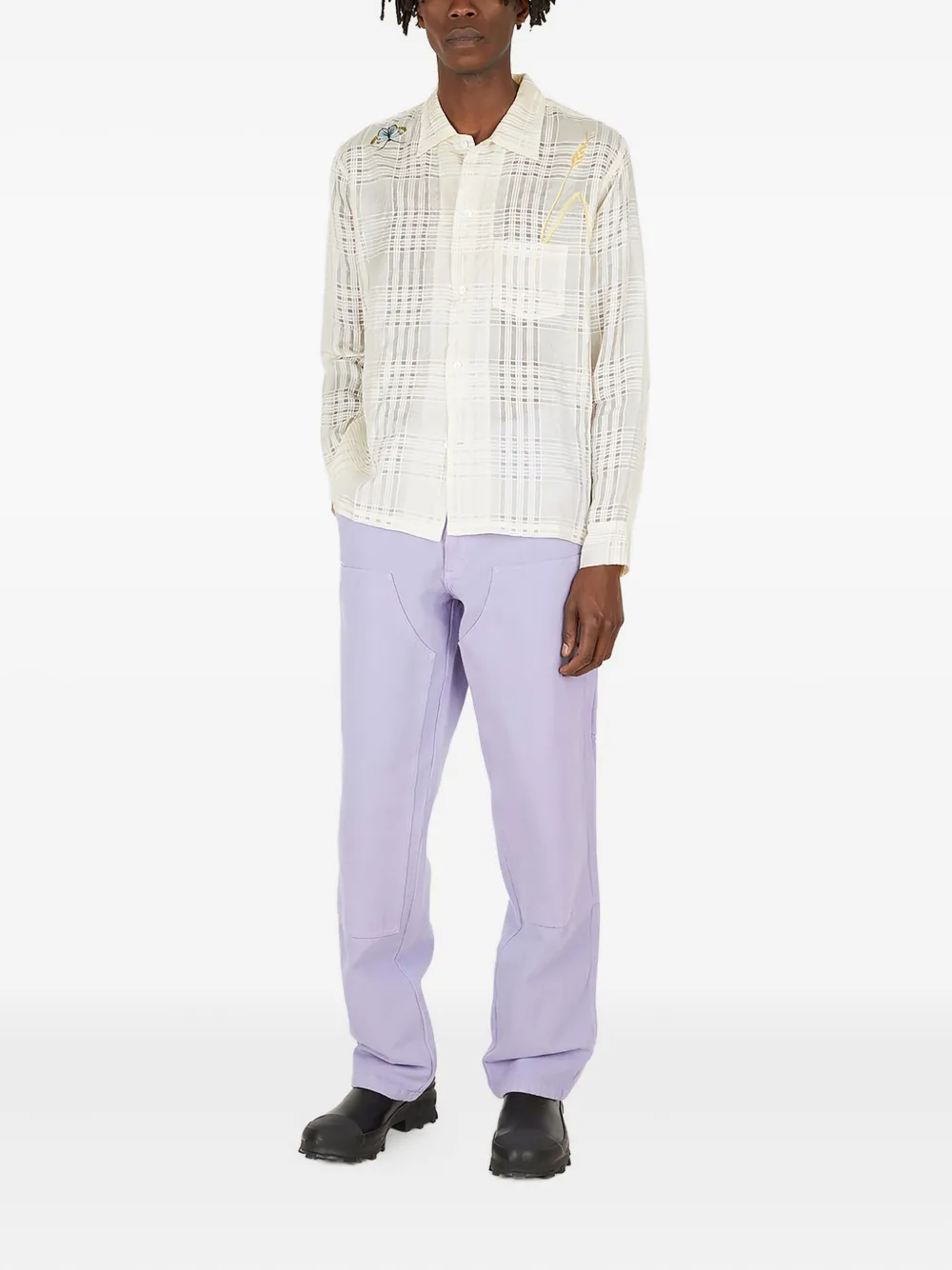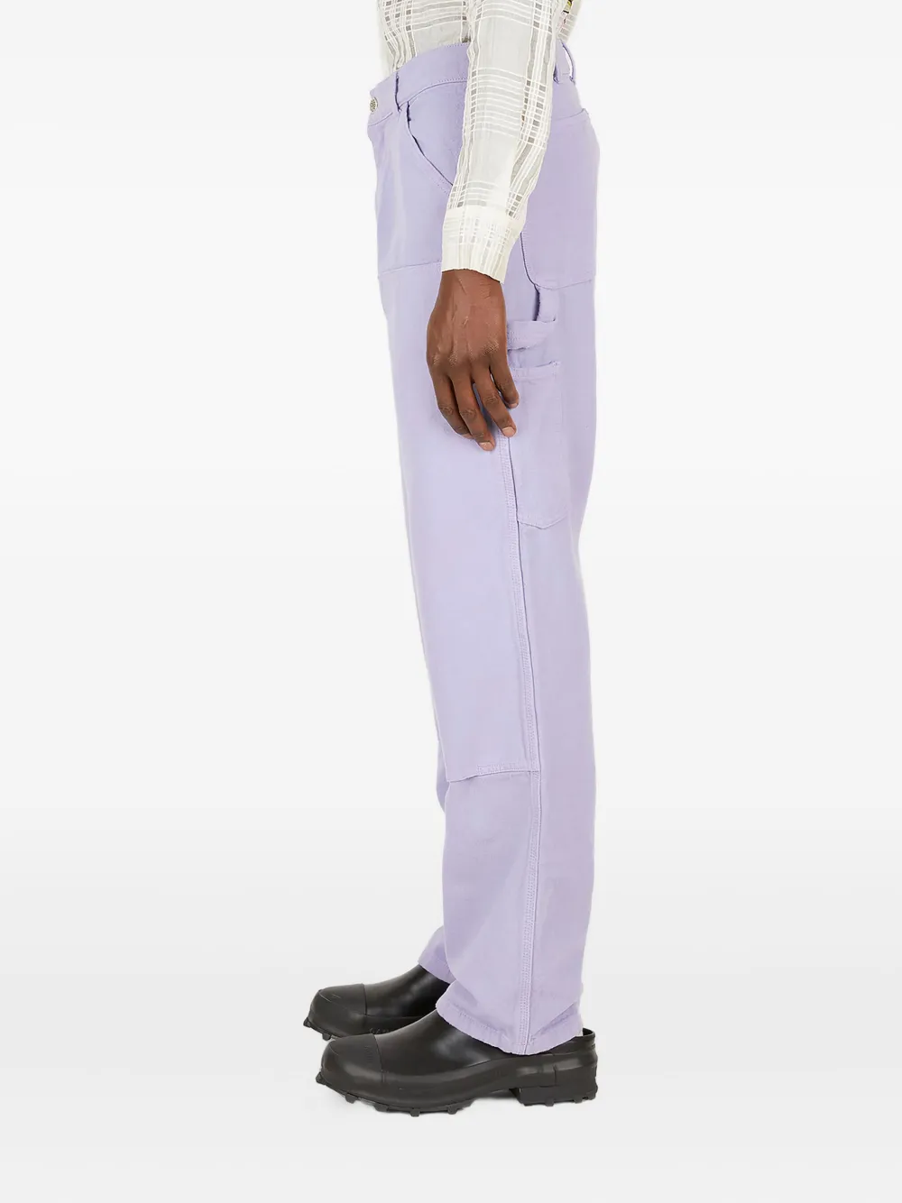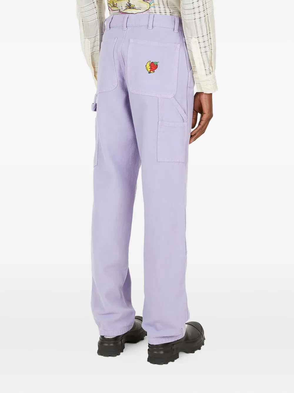 Сиреневый хлопок, множество карманов, высокая посадка, потайная застежка на пуговицы, сзади графическая вышивка