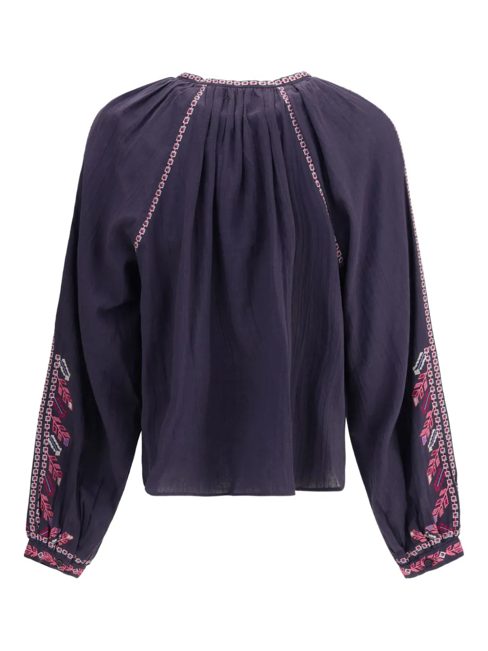 Фиолетовая цветочная вышивка, длинные рукава, застежка на пуговицы, вышитые манжеты, присборенный вырез