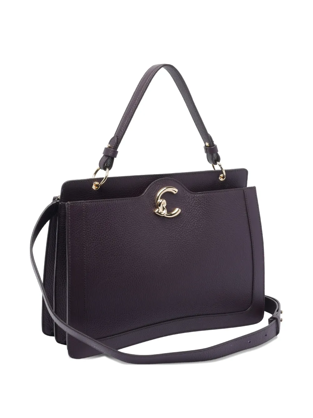 Фиолетовая телячья кожа, два отделения, магнитная застежка C-Me, застежка-молния, съемная ручка, регулируемый плечевой ремень