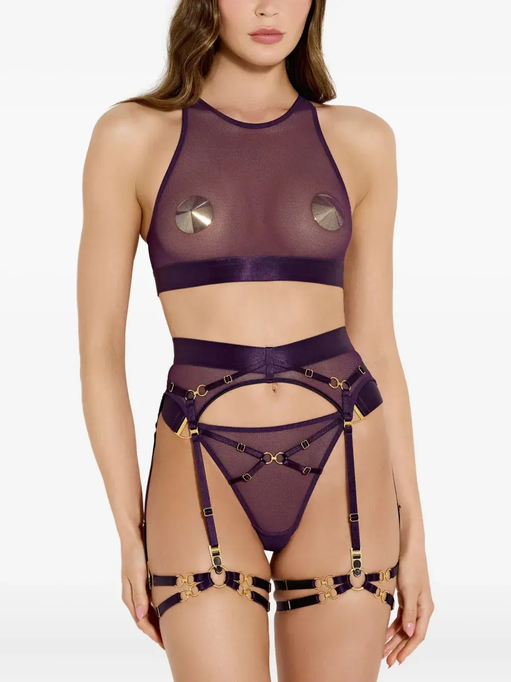 Сетчатая панель темно-фиолетового цвета, фурнитура с 24-каратным золотым покрытием, перекрестный дизайн. Напоминаем, что это изделие следует примерять поверх собственной одежды.