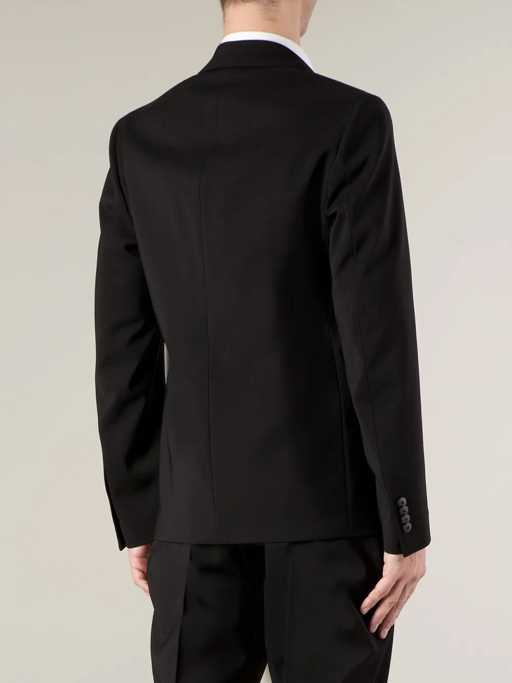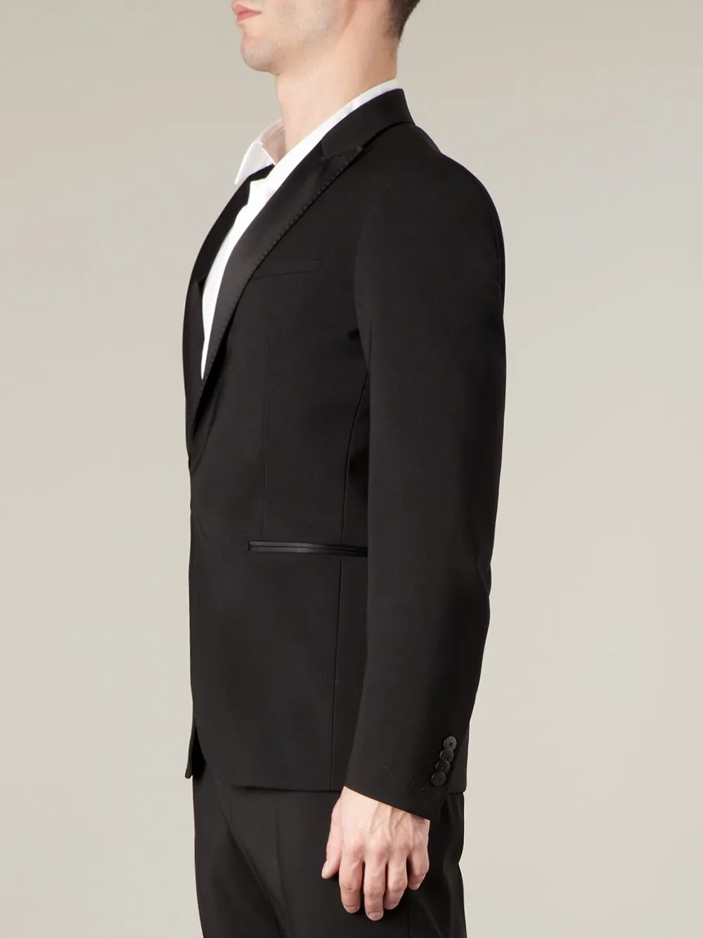 Черный шерстяной смокинг от L'éclaireur. Заостренные лацканы, нагрудный карман, застежка на пуговицах спереди, два передних кармана, длинные рукава, манжеты на пуговицах.
