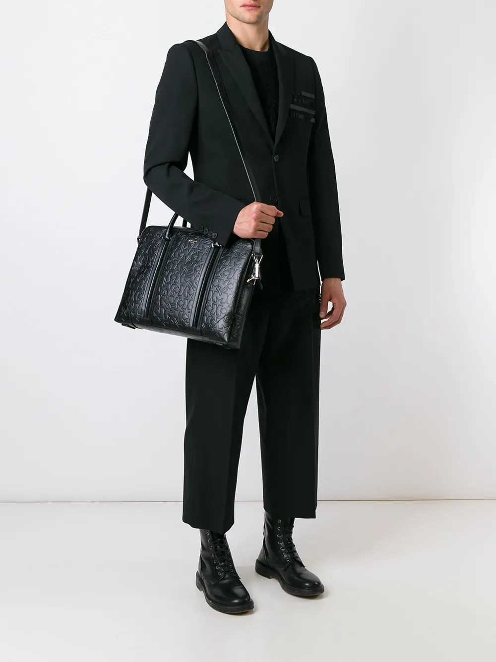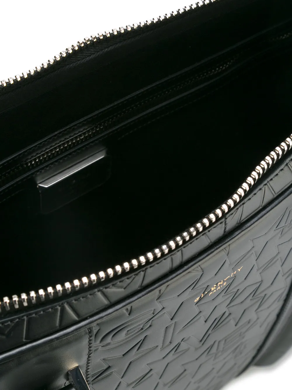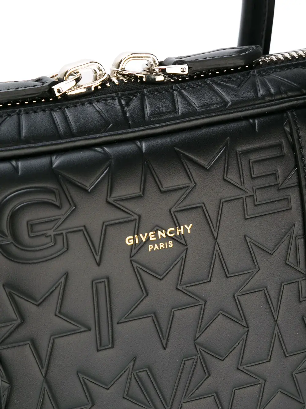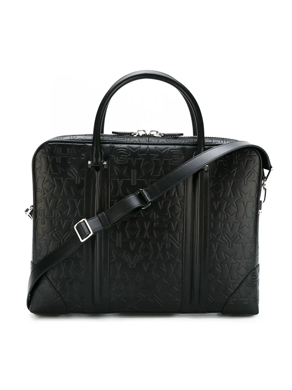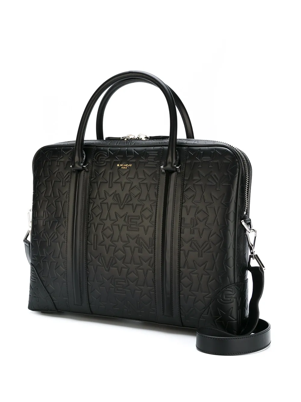 Черный кожаный портфель 'Lucrezia' от Givenchy. Закругленные ручки, печать с логотипом в центре спереди, съемная регулируемая лямка на плечо, серебристая фурнитура, застежка на молнии сверху, цельная подкладка, внутренний карман на молнии, внутренняя бляшка с логотипом.