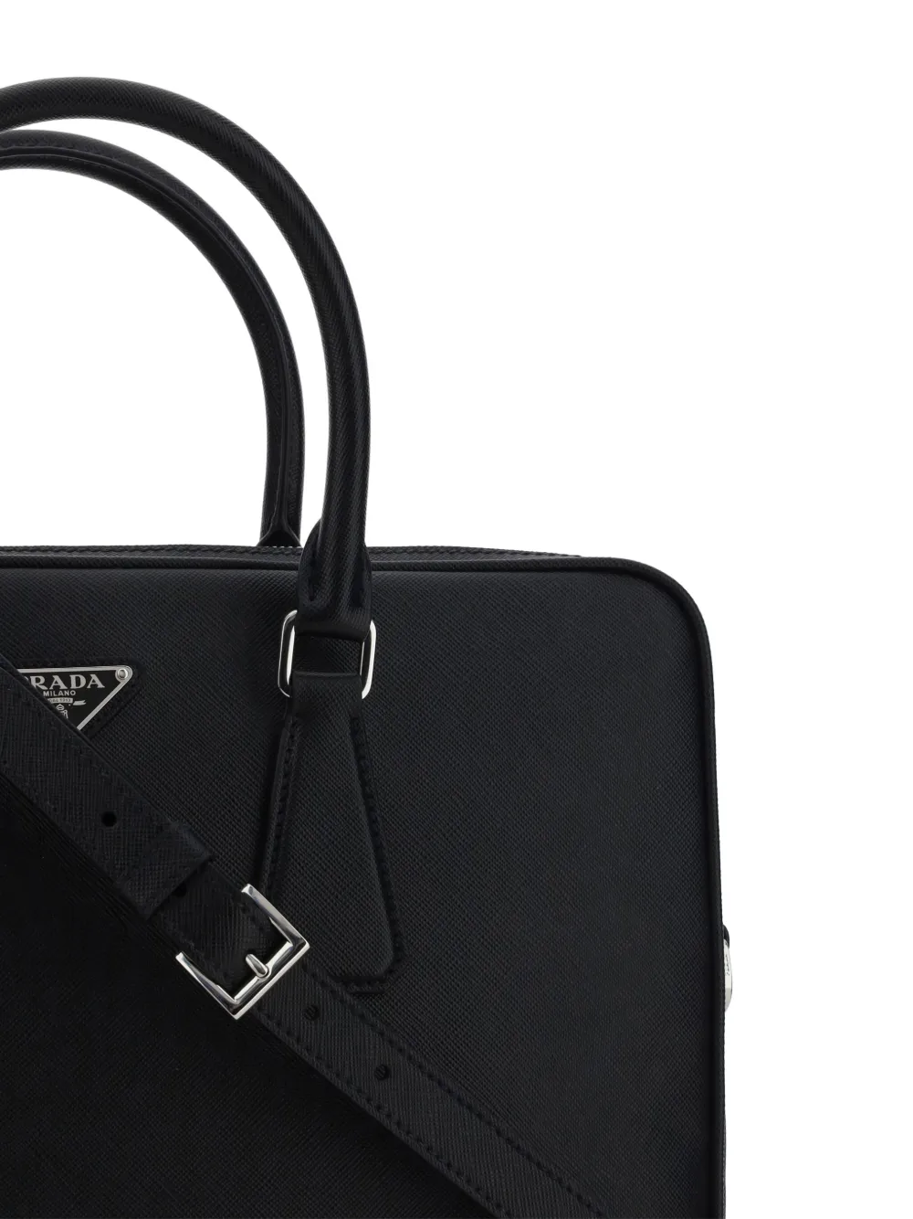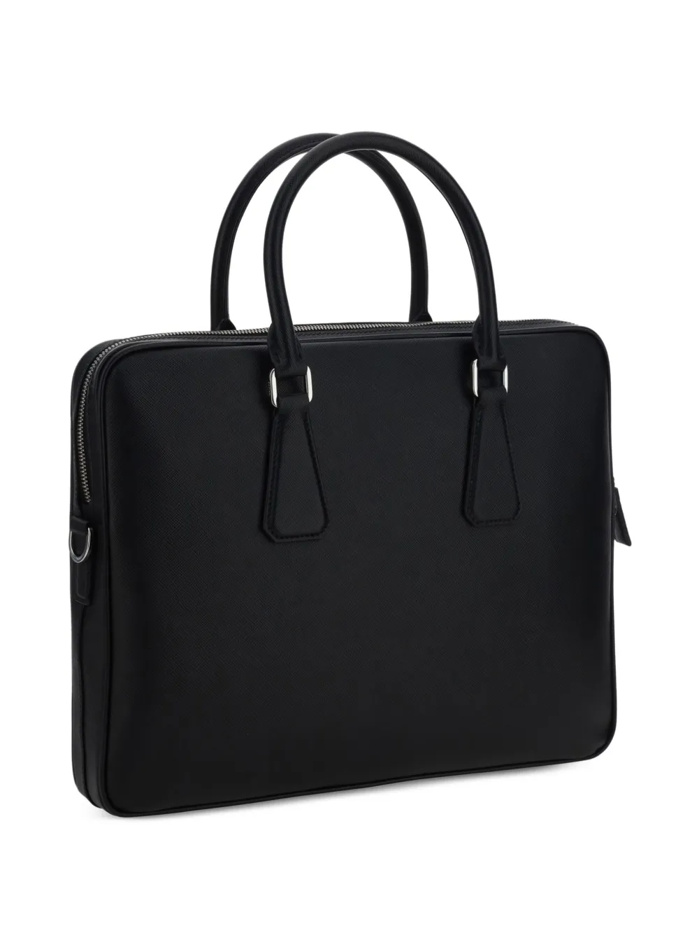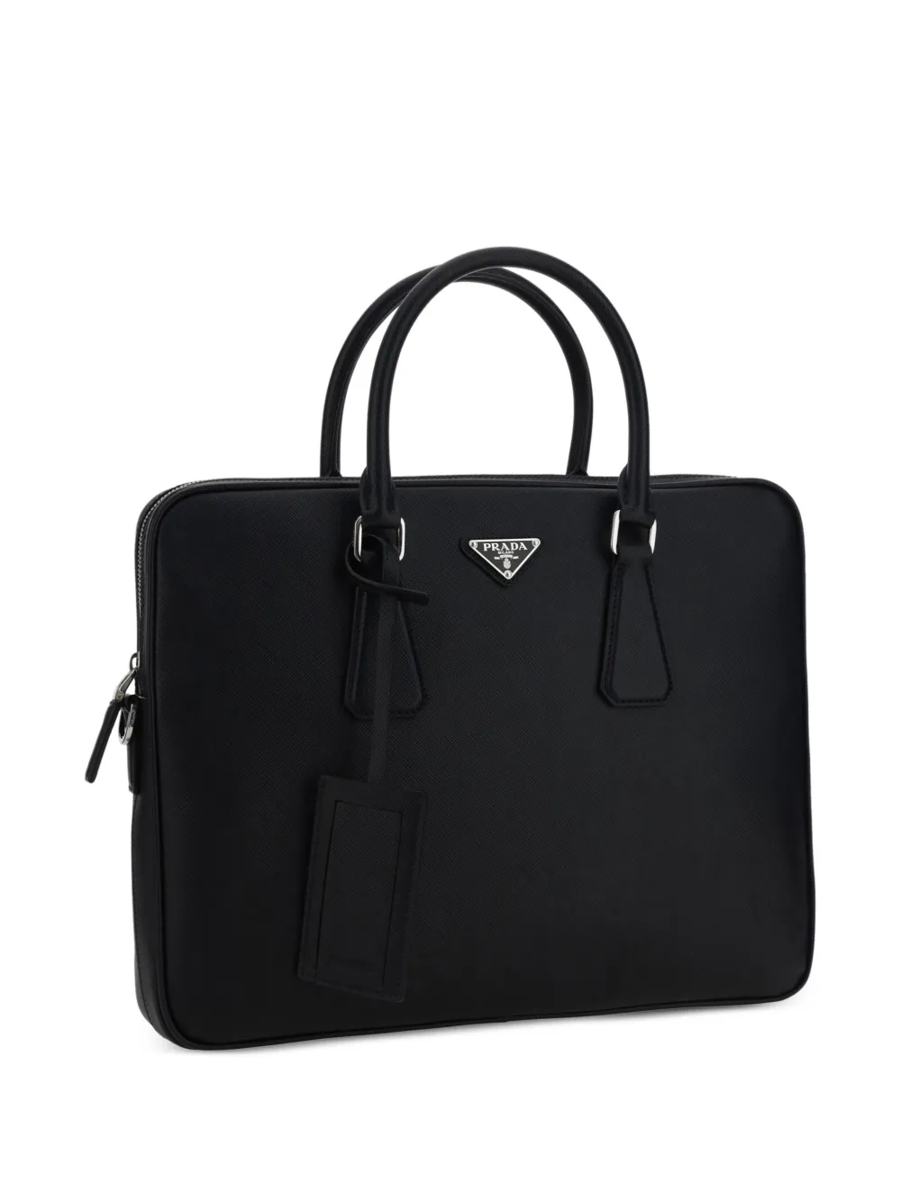 Сафьяновая кожа, треугольный эмалированный логотип, серебристая фурнитура, застежка на молнии сверху, две верхние ручки, съемный регулируемый ремень на плечо и основное отделение. Цвет: черный.