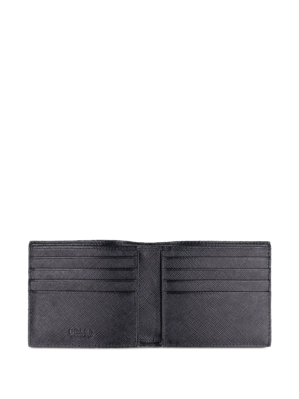 Современный и динамичный бренд Prada (Прада) за долгие годы успел собрать множество поклонников и последователей. Особой популярностью пользуются аксессуары. Среди них можно найти черный бумажник из телячьей кожи. Бумажник с фактурной поверхностью дополнен серебристым металлическим логотипом и имеет несколько отделений для карт.