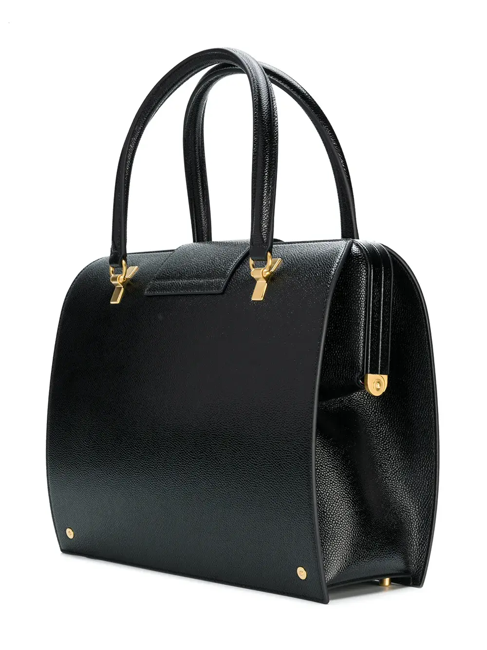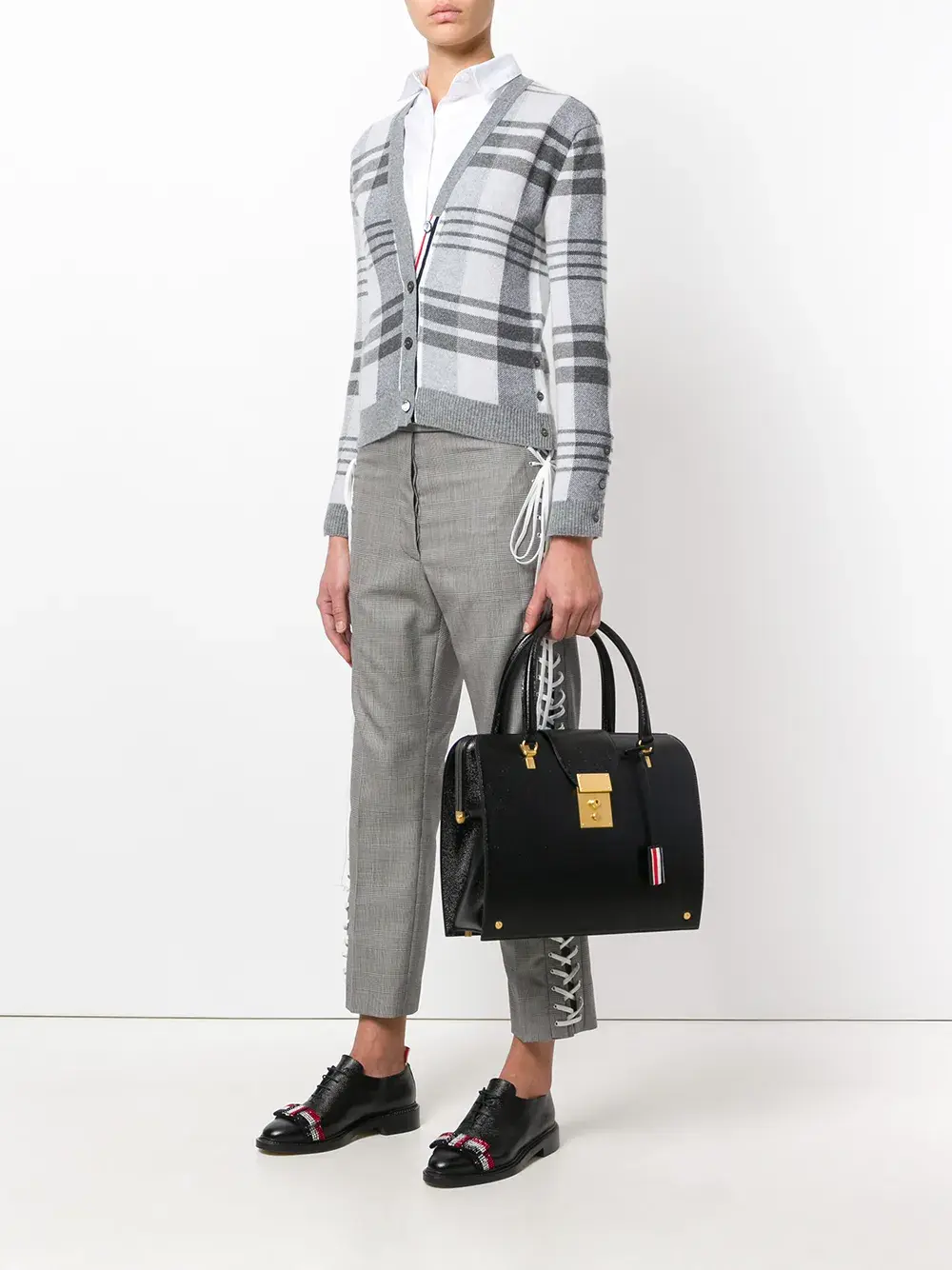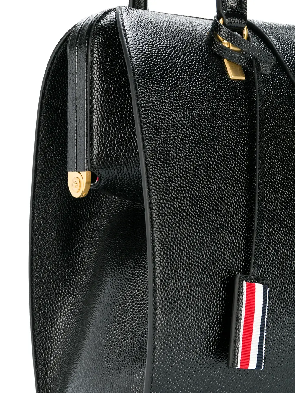 Черная кожаная сумка 'Mrs. Thom' от Thom Browne(Том Браун). Закругленные ручки, главный внутренний отдел, внутренний карман на молнии, внутренняя вставка с логотипом, печать с логотипом в центре спереди, золотистая фурнитура, зернистая фактура кожи, кожаный ярлык, замок с ключом, подкладка в полоску.