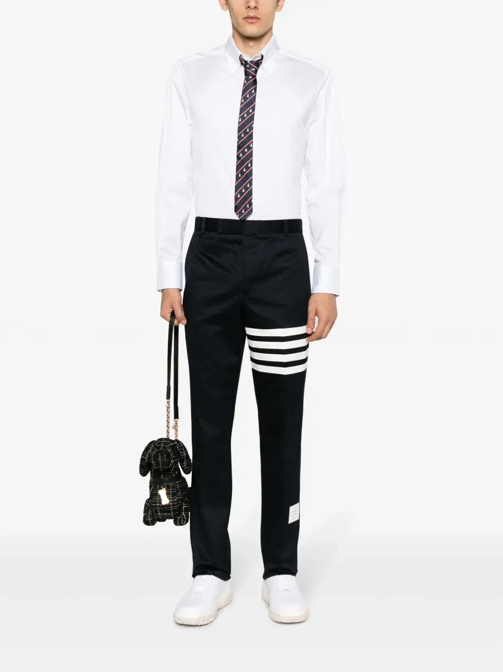 брюки с принтом и полосками 4-Bar от THOM BROWNE. Средняя посадка, узкий крой, ширинка на молнии с пуговицей, пояс с петлями для ремня, прорезные карманы по бокам, два задних прорезных кармана на пуговицах, складки, отрезная длина и фирменная трехцветная полоска.