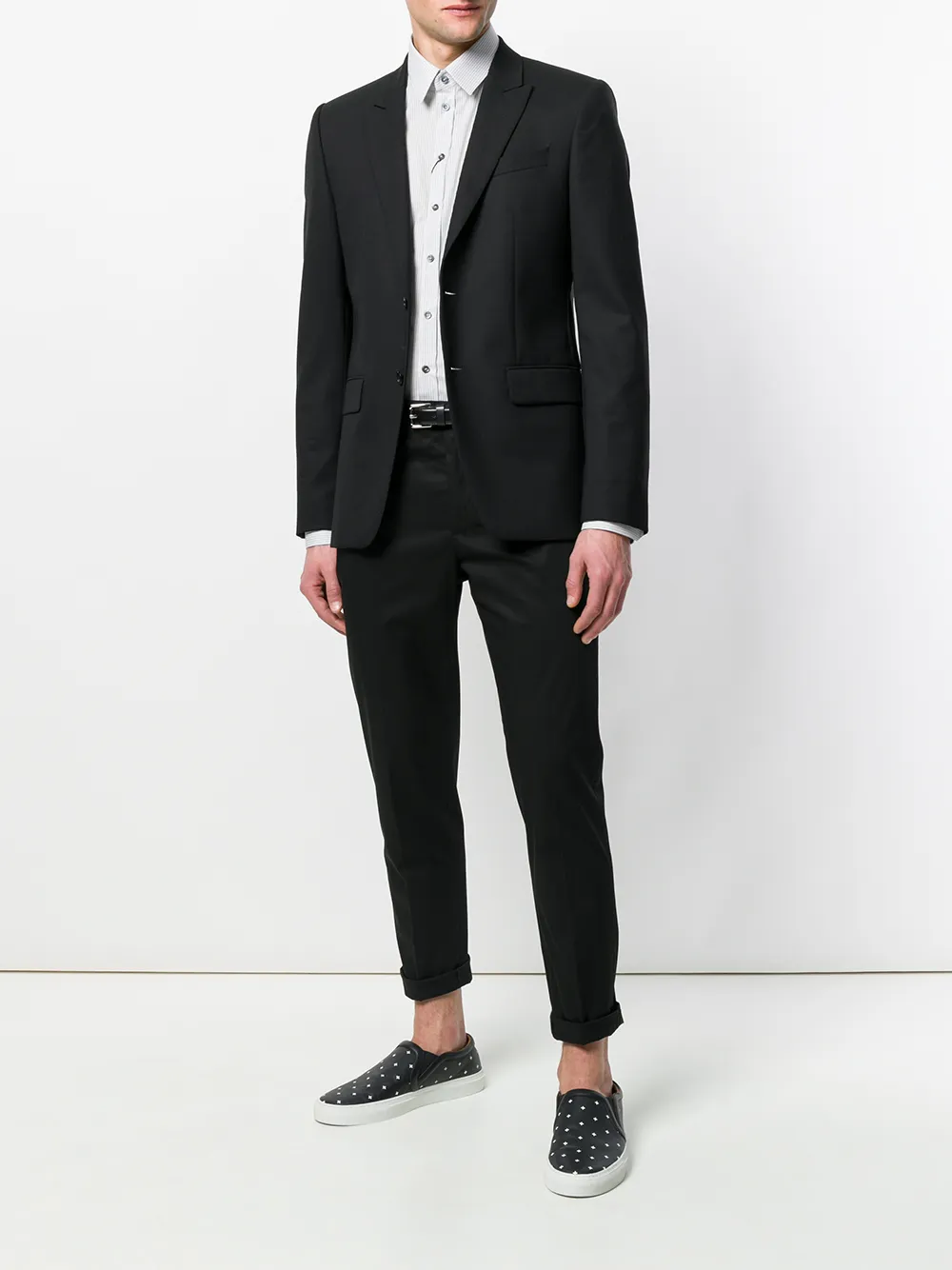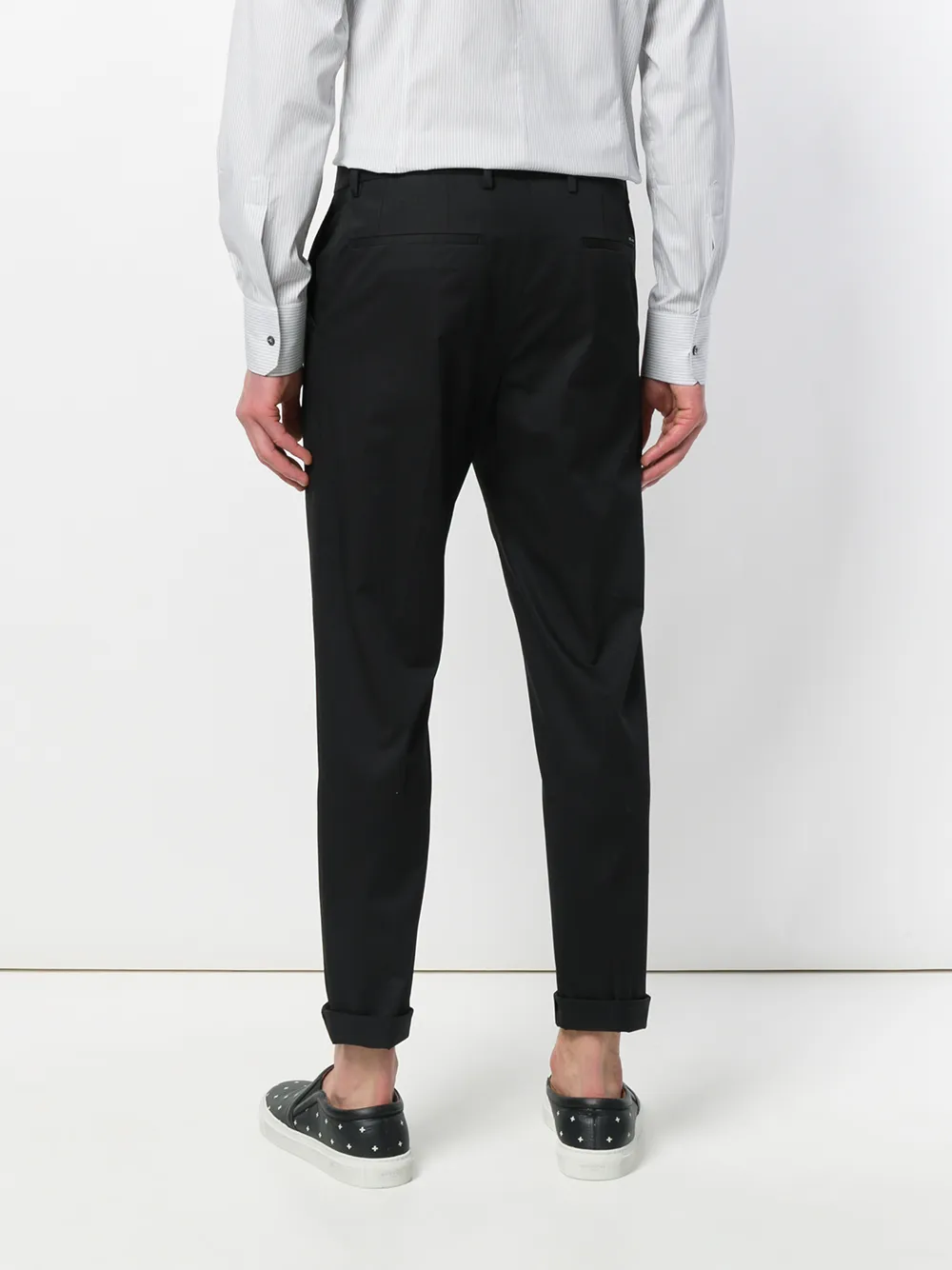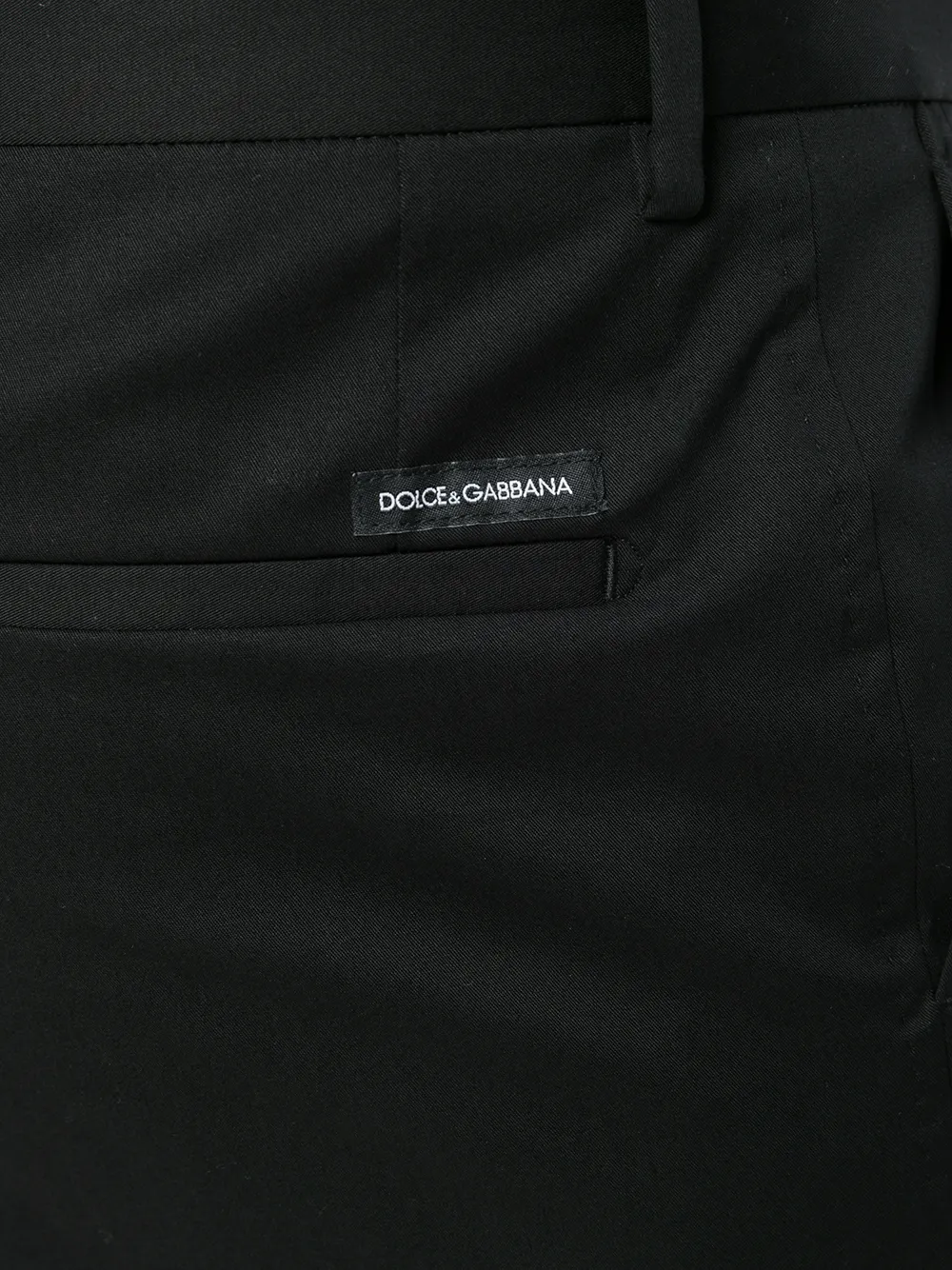 Подробнее о товаре: Dolce & Gabbana - яркий пример успешного союза классического итальянского стиля и сицилийской экспрессии. В коллекцию бренда вошли черные классические брюки чинос из эластичного хлопка от Dolce & Gabbana (Дольче энд Габбана). Пояс с петлями для ремня, ширинка на молнии с пуговицей, боковые карманы, задние прорезные карманы с окантовкой и логотип сзади.