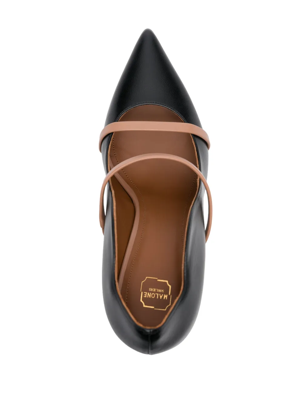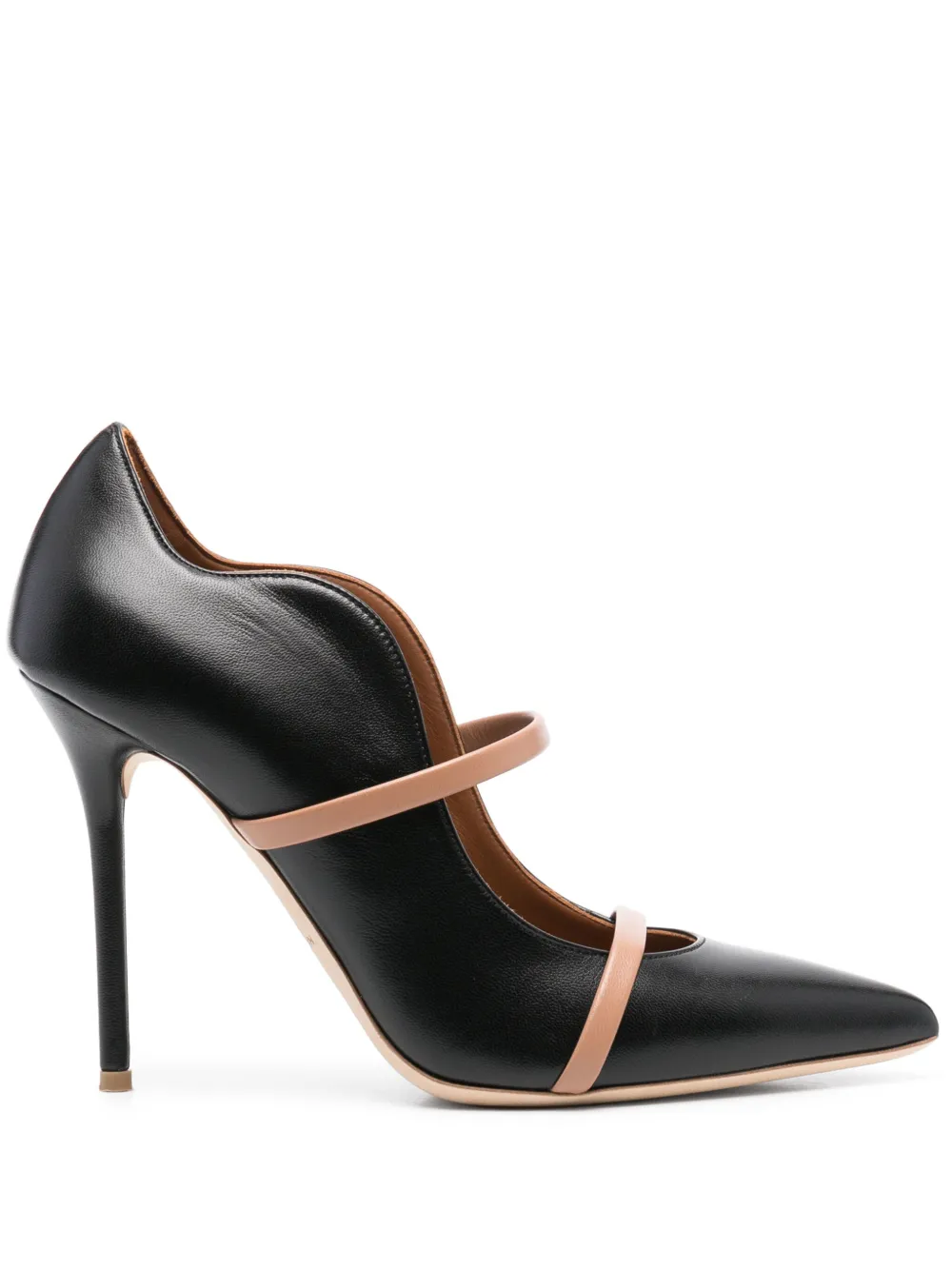Черные туфли-лодочки 'Maureen' из кожи наппа от Malone Souliers. Заостренный носок, фестончатый вход для ноги, высокая шпилька, бежевые ремешки.