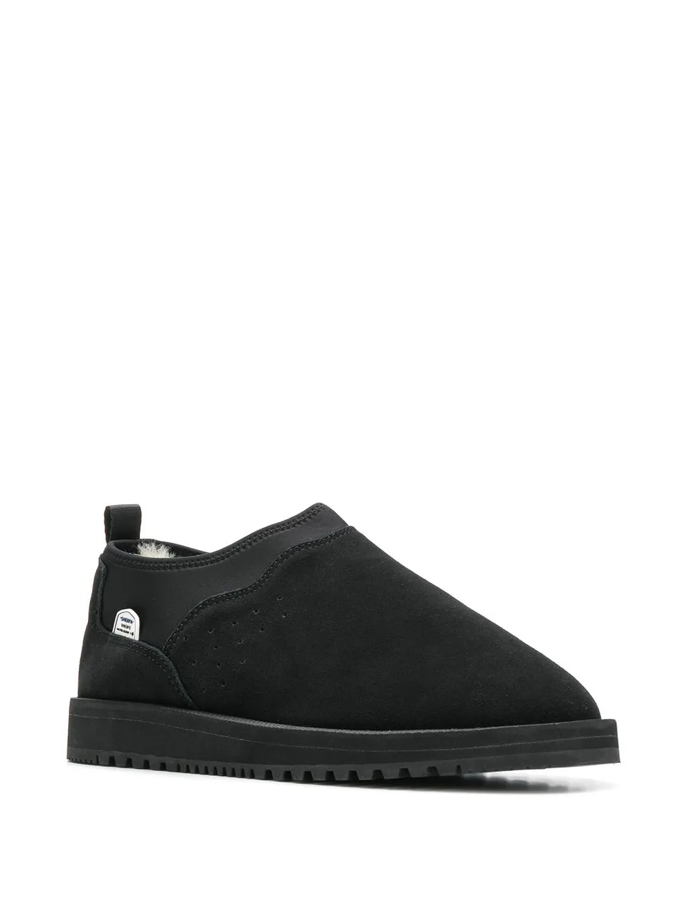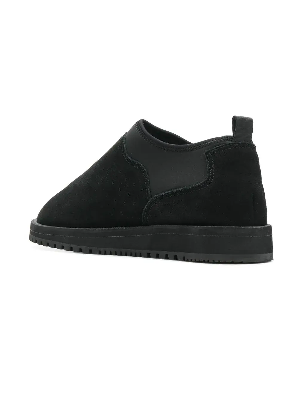 Черные замшевые ботинки Ron VM2 от Suicoke. Ребристая резиновая подошва, петля для подтягивания сзади, фирменная стелька, модель слип-он, без застежки, закругленный носок.