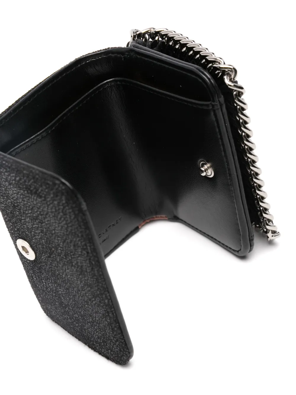 Кошелек 'Falabella' от Stella McCartney (Стелла Маккартни). Отделка цепочкой по краю, серебристая фурнитура, откидной верх с застежкой-защелкой, внутреннее клеймо с логотипом и отделение для купюр. Цвет: черный.