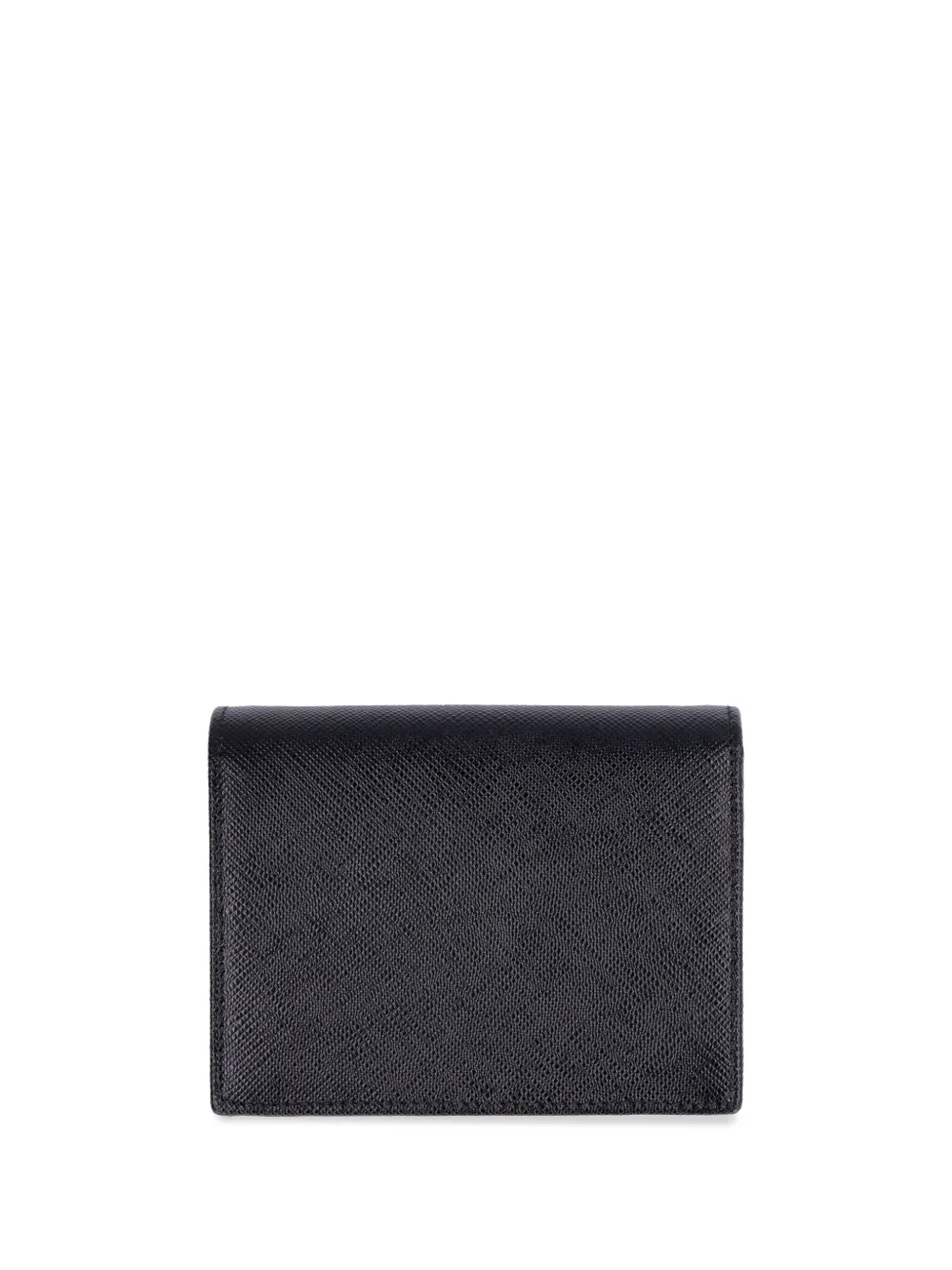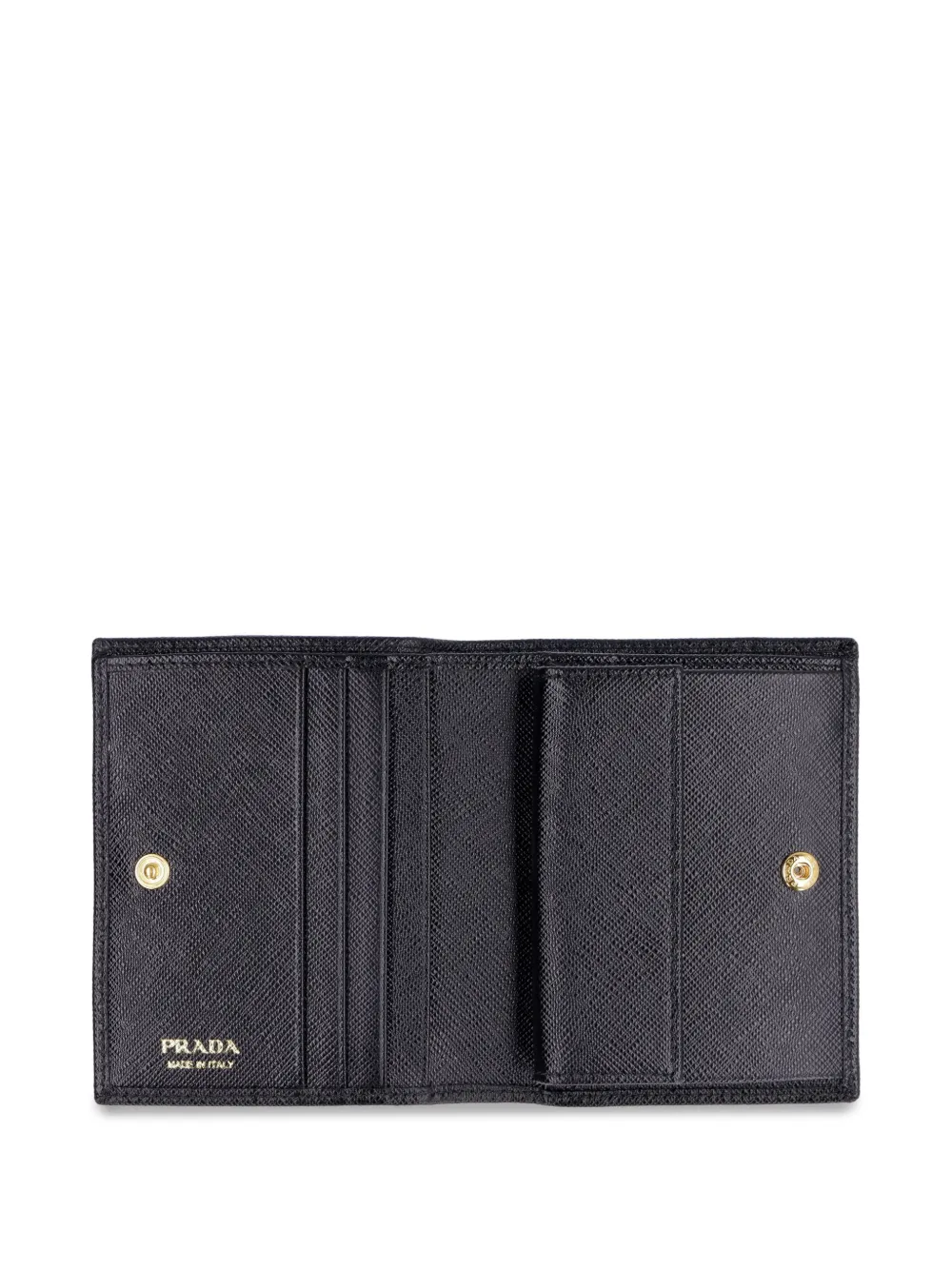 Маленький кошелек из кожи Saffiano от Prada (Прада). Откидной верх с застежкой-защелкой, золотистая бляшка с логотипом, несколько отделений для карт и внутреннее клеймо с логотипом. Цвет: черный.