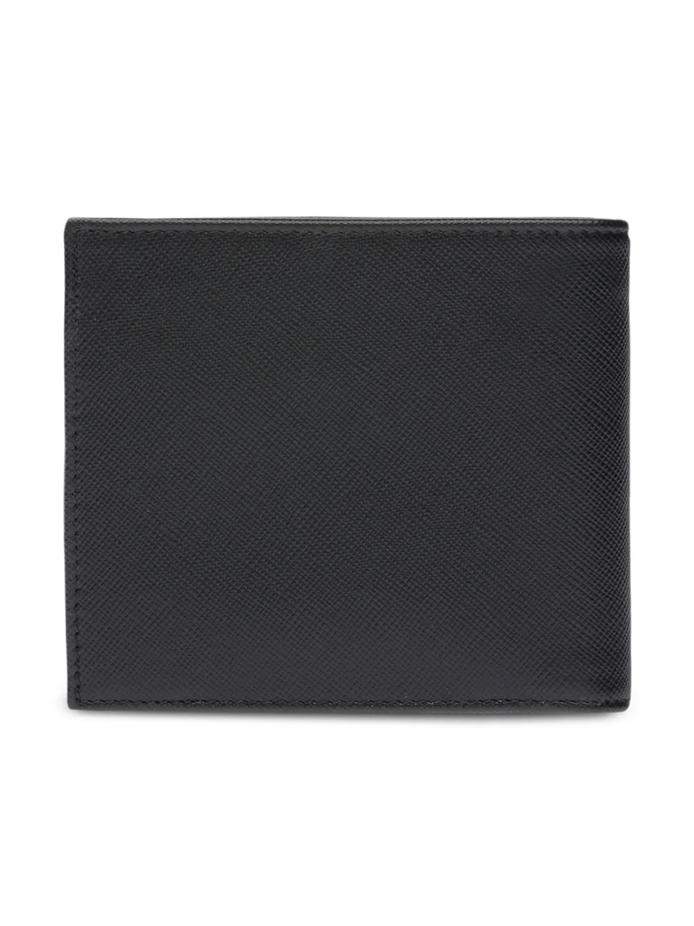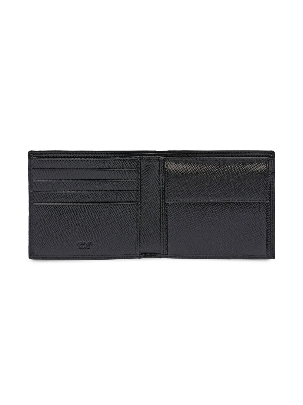 Кошелек в два сложения от Prada. Бляшка с логотипом спереди, multiple interior card slots, отделение для купюр и карман для монеток. Цвет: черный.