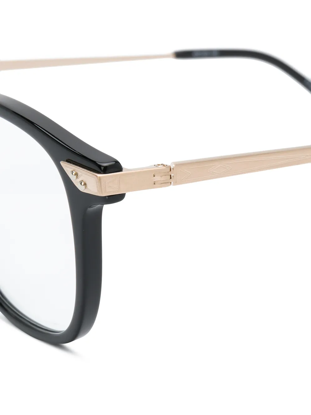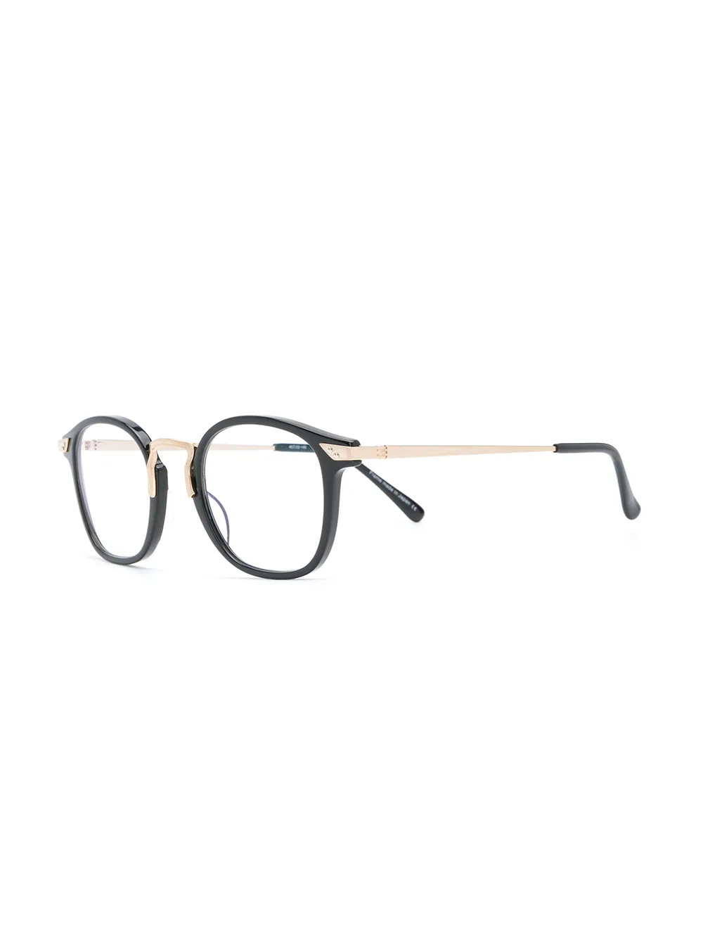 Круглые очки от Matsuda. Прямые дужки с изогнутыми концами, застежка на шарнире, микро заклепки, круглые оправы и логотип бренда на внутренней стороне дужки. Модель в стиле унисекс.