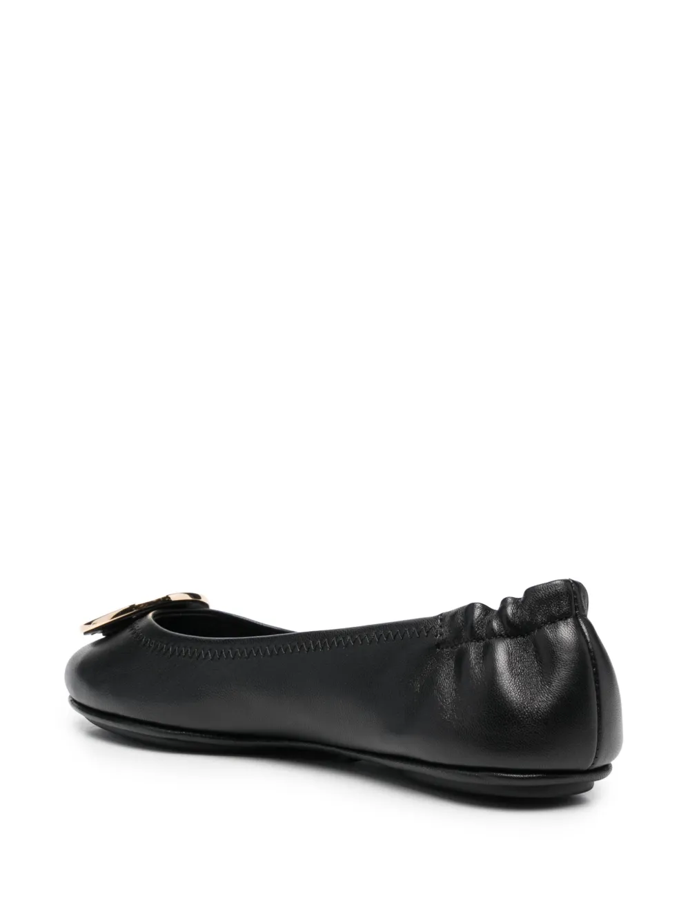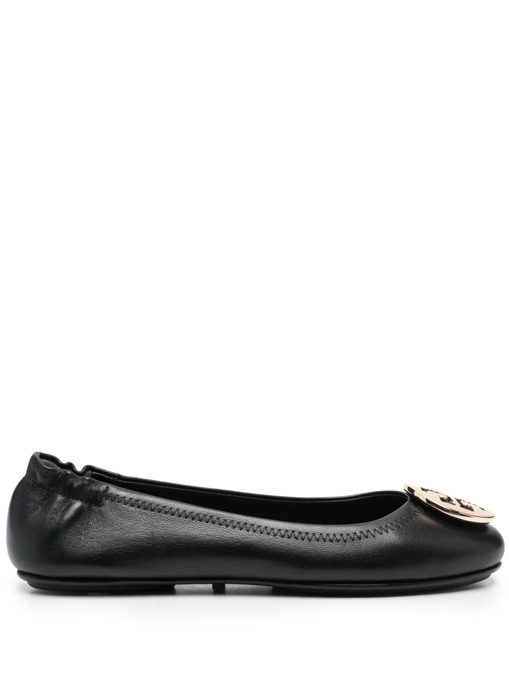 Балетки с логотипом от Tory Burch (Тори Берч). Закругленный носок, модель слип-он, без застежки, золотистая бляшка с логотипом, фирменная стелька и плоская подошва. Цвет: черный.