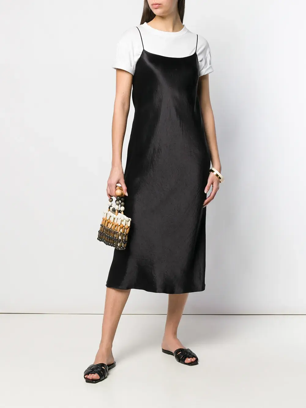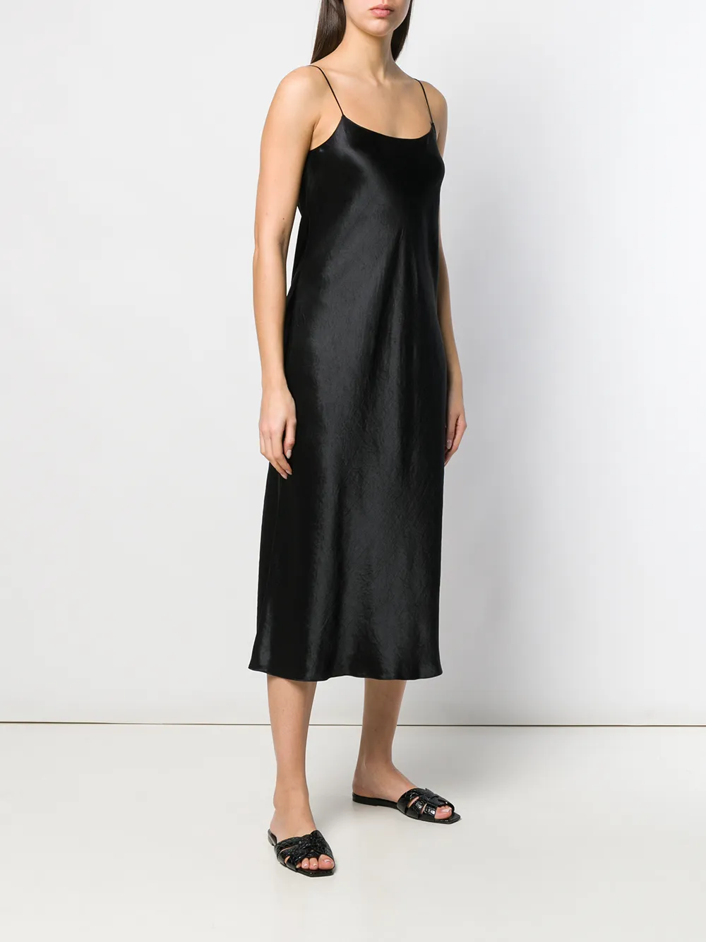Платье миди на бретелях от Vince (Винс). Тонкие лямки-спагетти, смещенный силуэт и прямой подол. Цвет: черный.