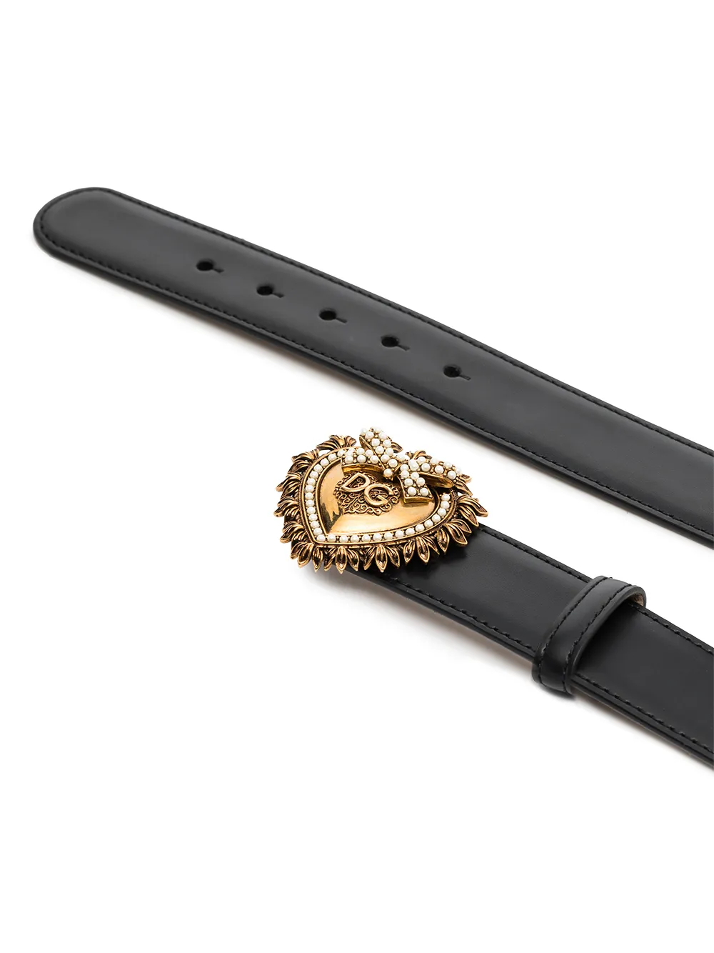 Поддайтесь искушению. Черный ремень Devotion из коллекции Dolce & Gabbana (Дольче энд Габбана) - именно то, чего вам не хватает. Он выполнен из телячьей кожи и украшен золотистой пряжкой в форме сердца с логотипом и искусственным жемчугом. Модель имеет регулируемый размер.