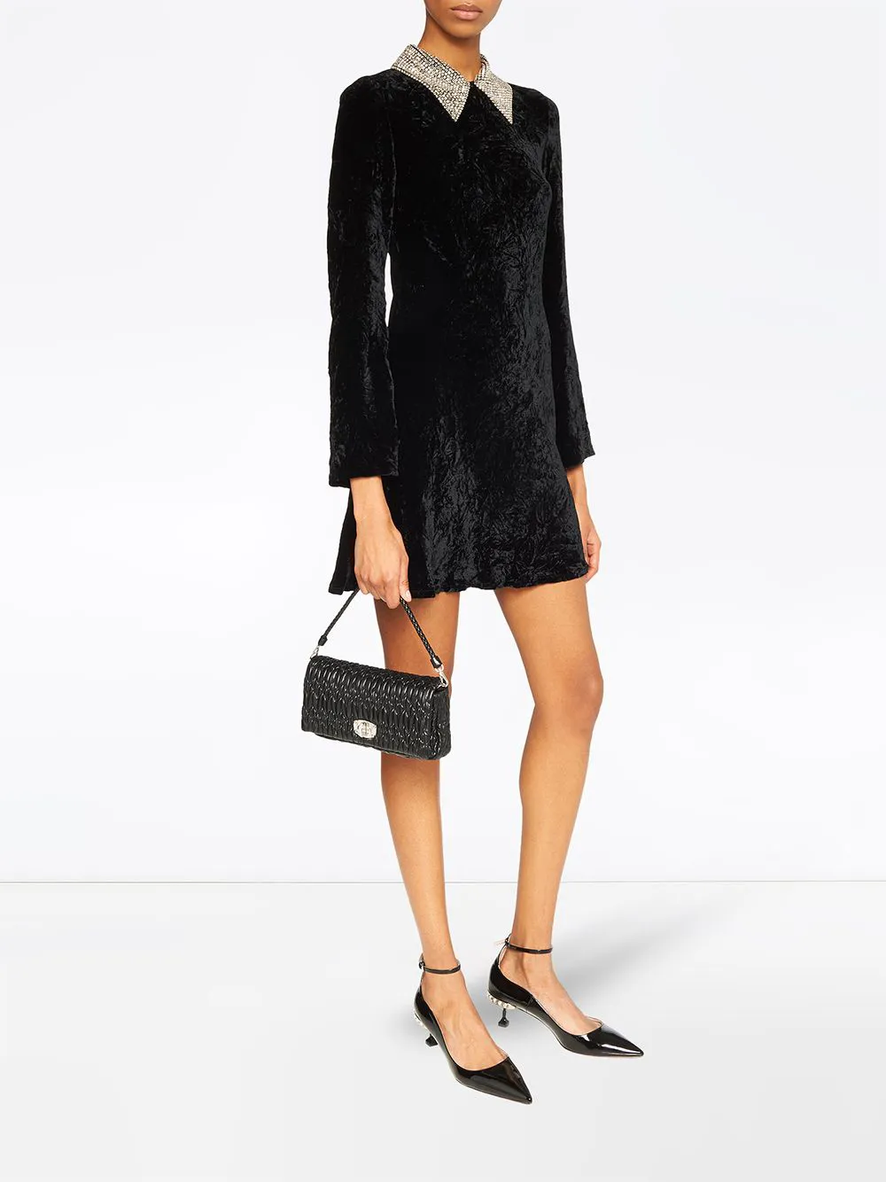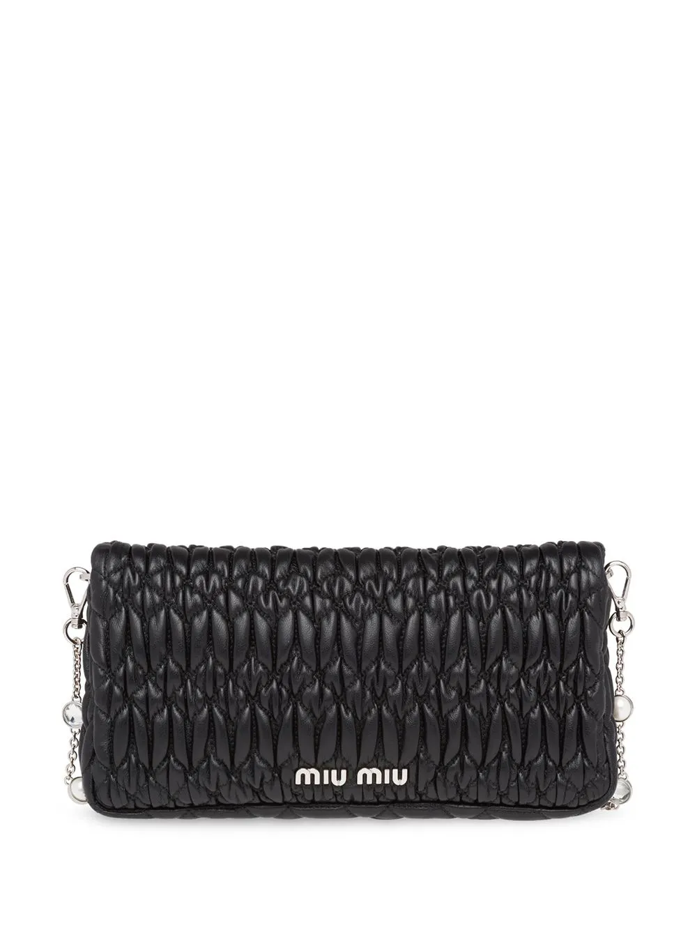 Сумка Miu Crystal от Miu Miu. Откидной клапан на застежке, главный внутренний отдел, внутренний металлический логотип и съемный регулируемый ремень на плечо. Цвет: черный.