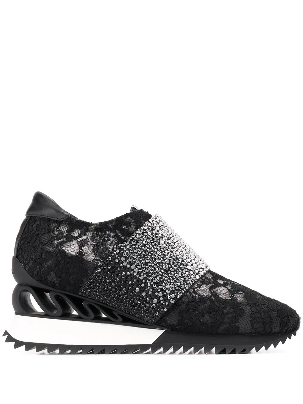 Кроссовки со стразами от Le Silla. Закругленный носок, заплатка с логотипом на язычке, узор из цветочного кружева и ребристая резиновая подошва. Цвет: черный.