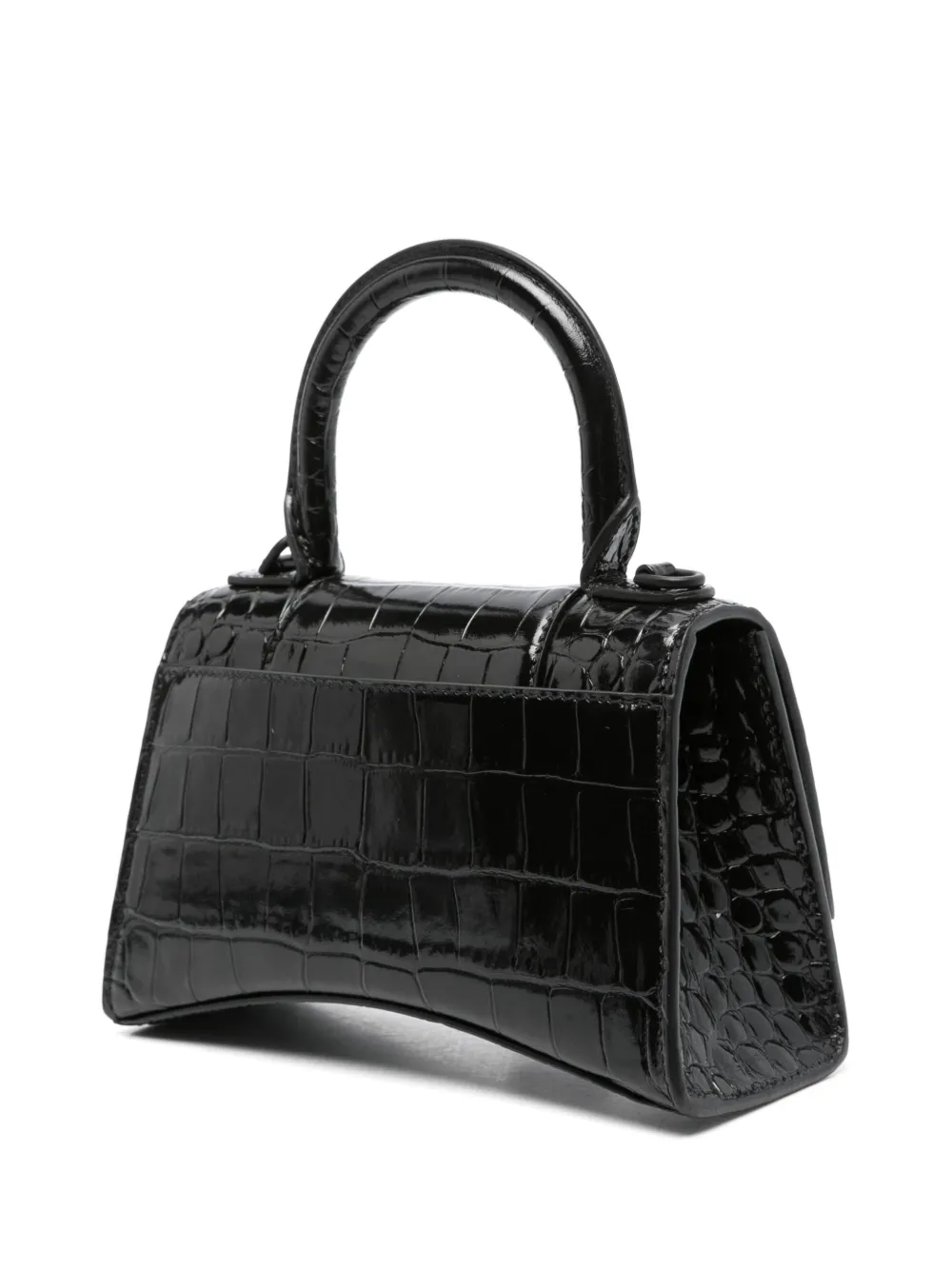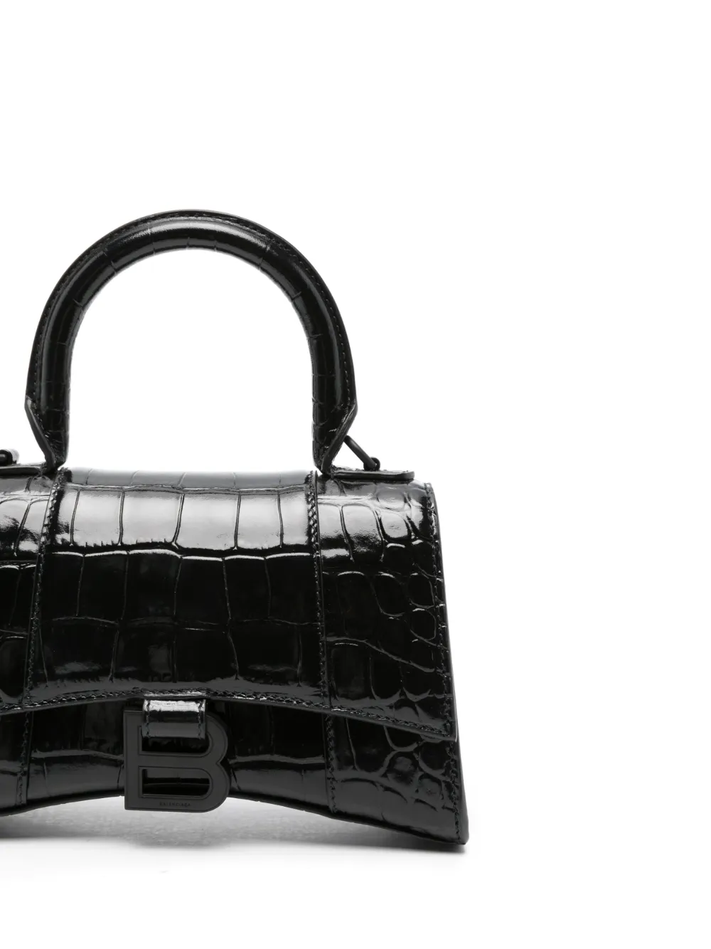 Сумка Hourglass XS от Balenciaga (Баленсиага). Закругленная ручка, съемный регулируемый ремень на плечо и откидной верх с застежкой-защелкой. Цвет: черный.