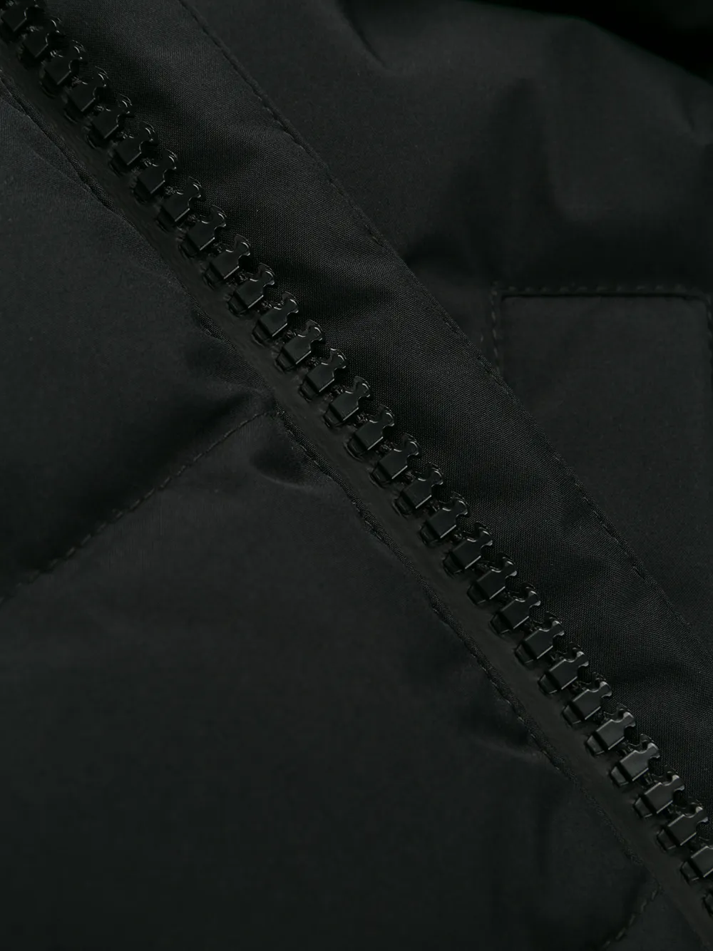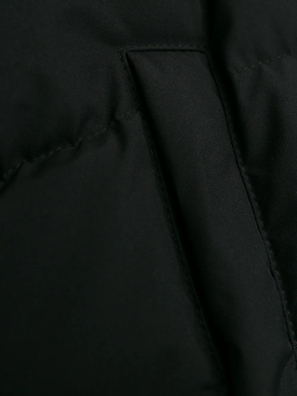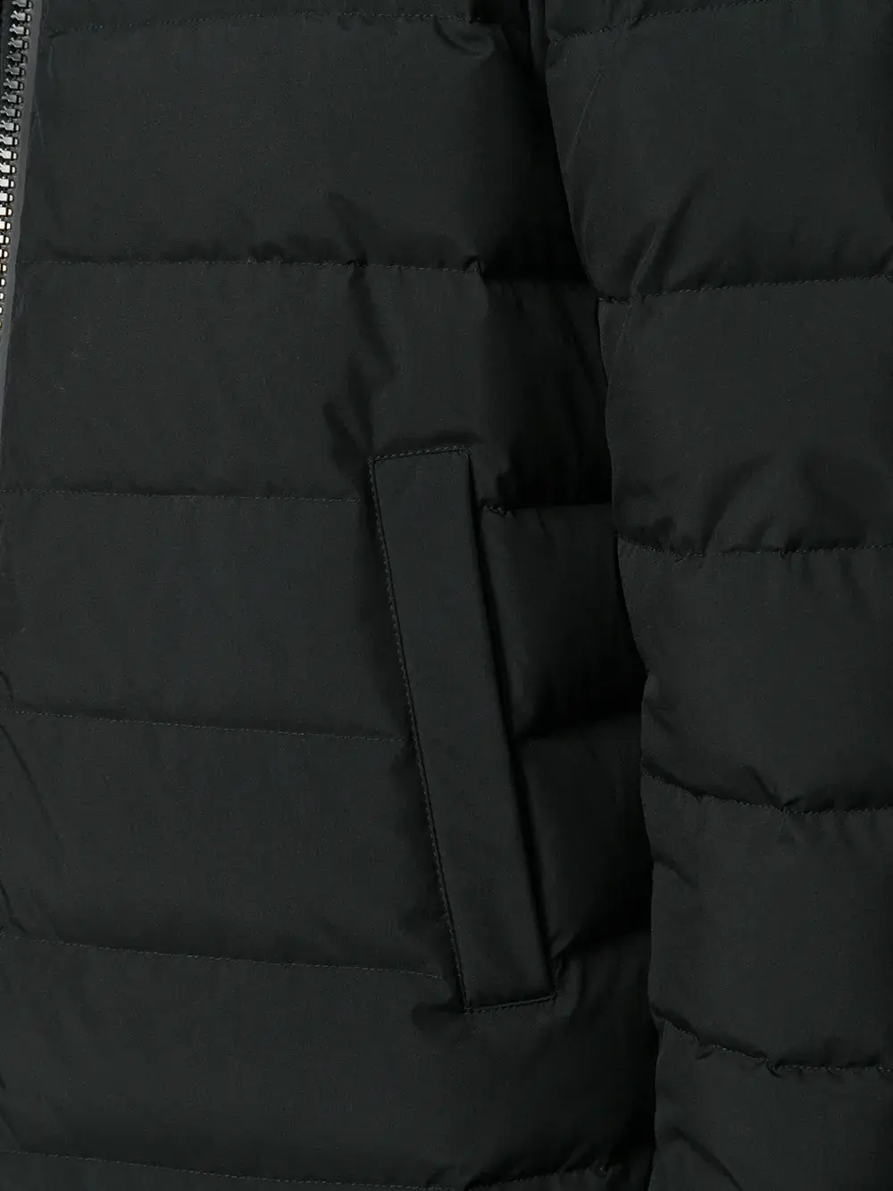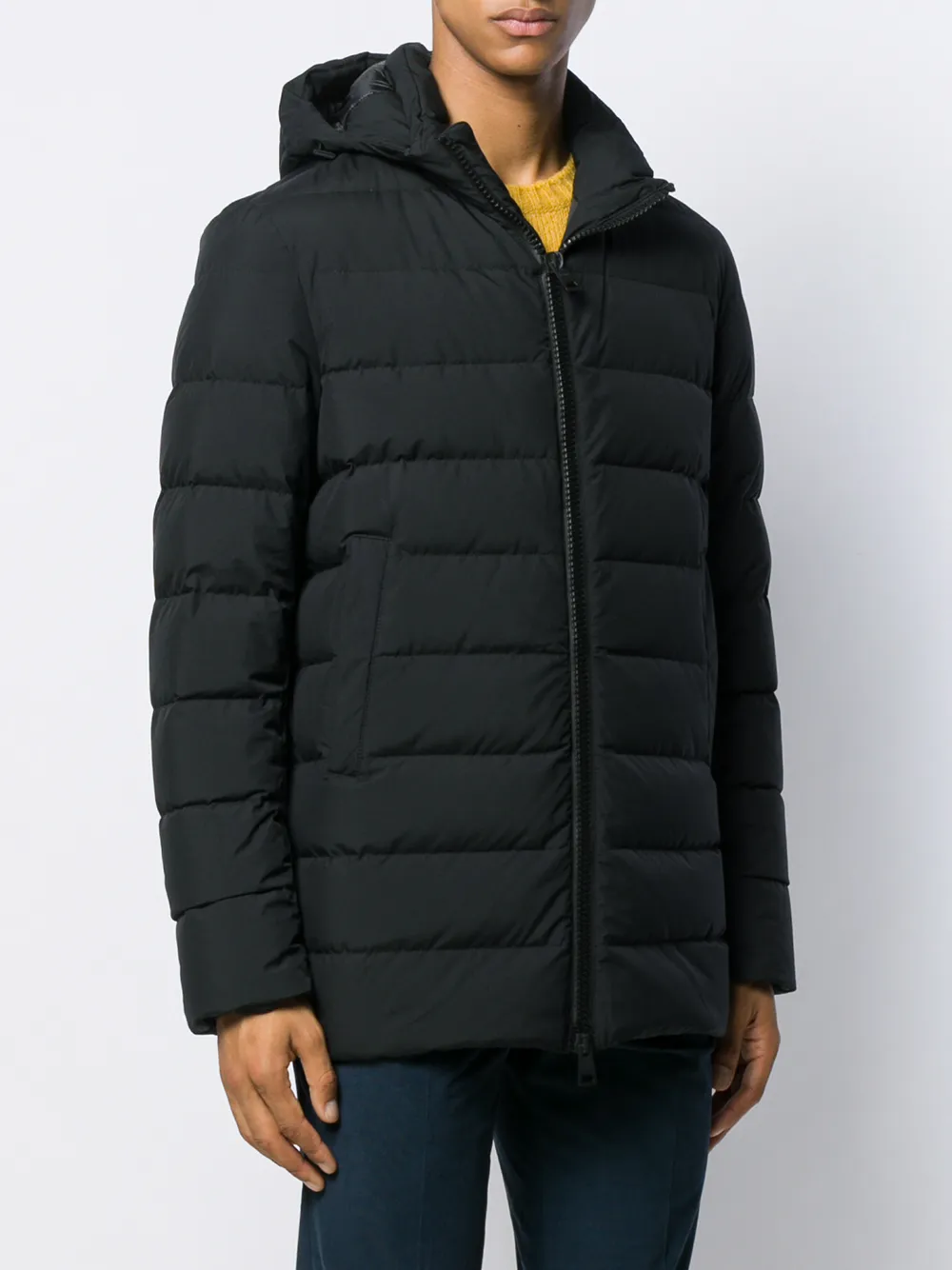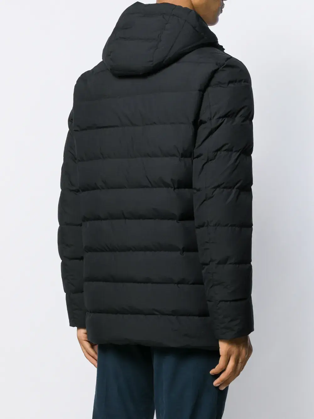 Пуховик с капюшоном от Herno (Херно). Застежка на пуговицах спереди, длинные рукава, стеганый эффект, обитая внутренняя сторона, прямой крой и прорезные карманы по бокам. Цвет: черный.