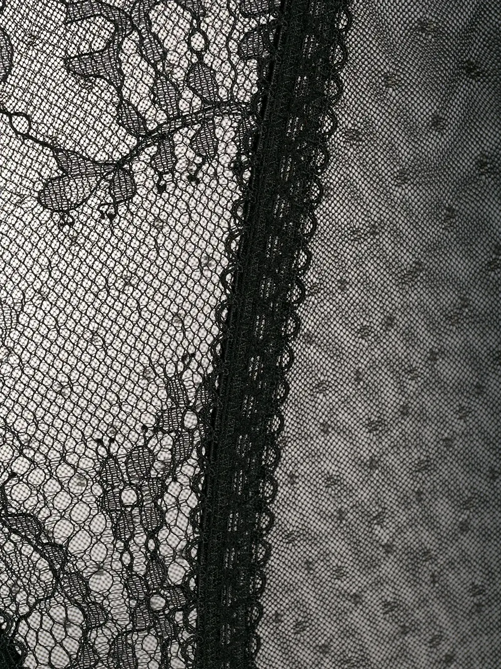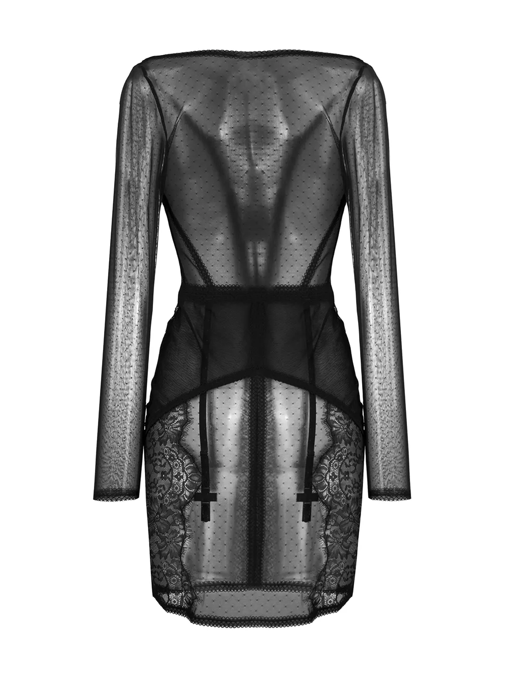 Платье Inspiration Divine от Maison Close. V-образная горловина, длинные рукава, деталь из кружева, прозрачная деталь, модель по фигуре, прямой подол и короткая длина. Цвет: черный.