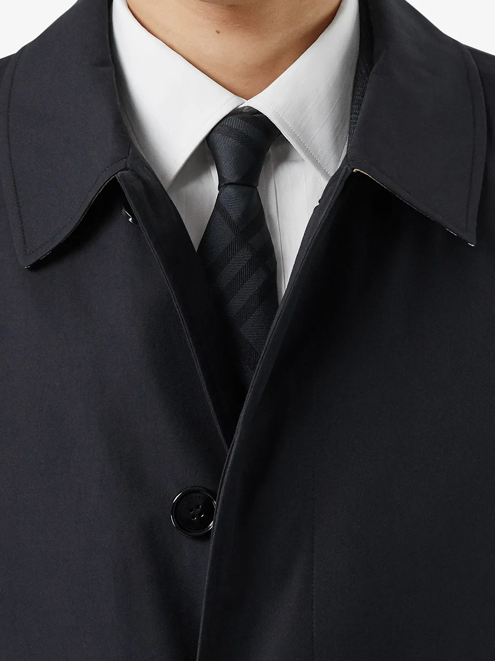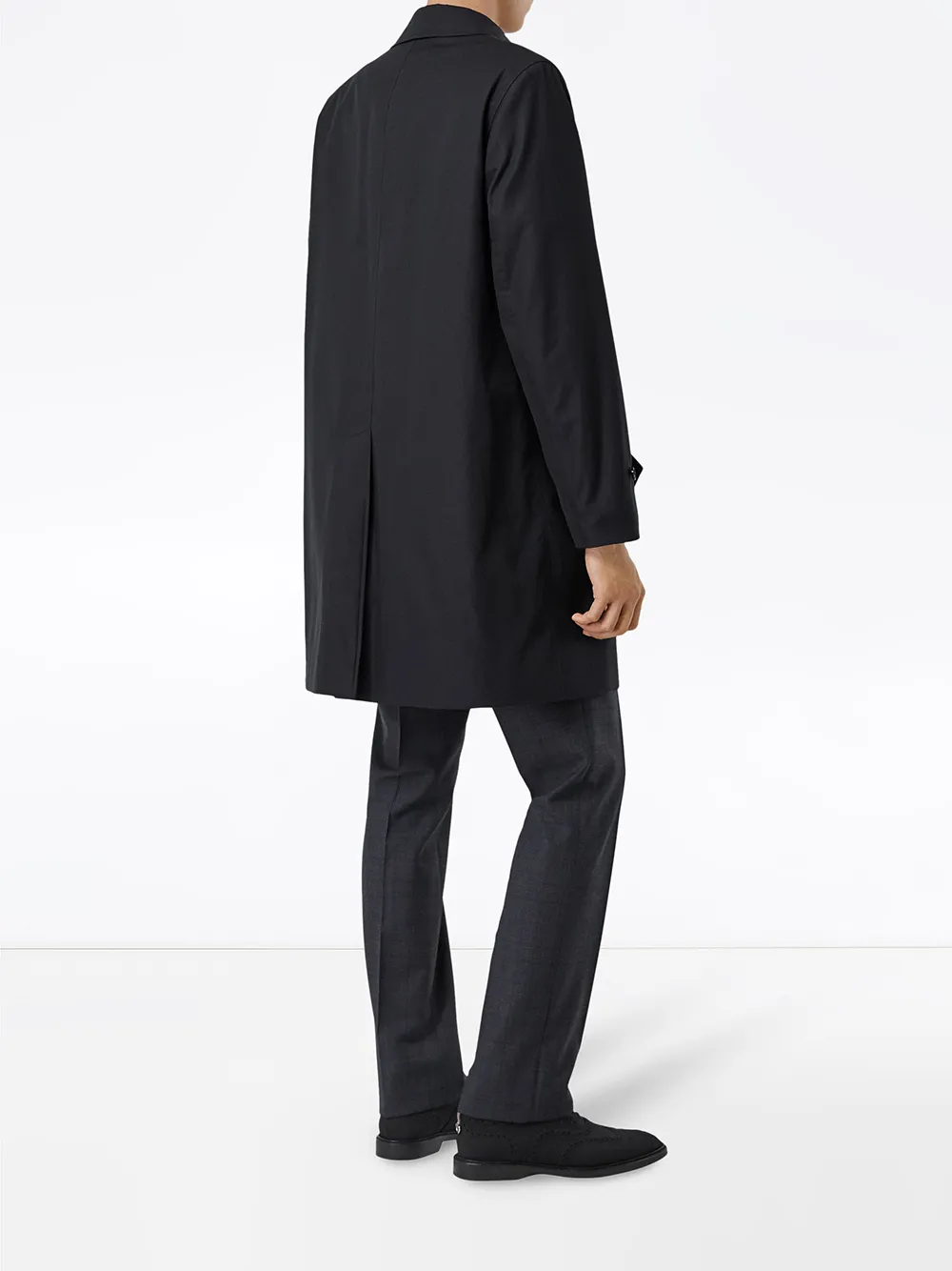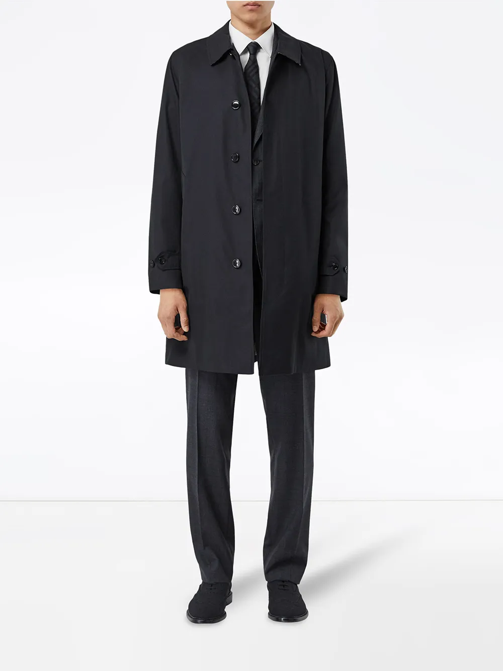 Темно-синее хлопковое пальто The Pimlico от Burberry (Берберри). Классический воротник, однобортный фасон, потайная застежка на пуговицах спереди, подкладка в клетку, длинные рукава, боковые карманы, шлица сзади.