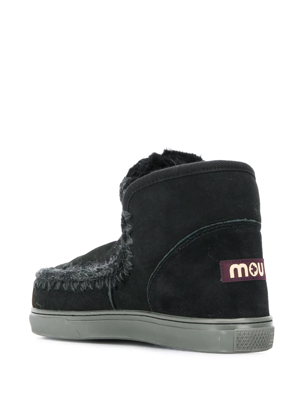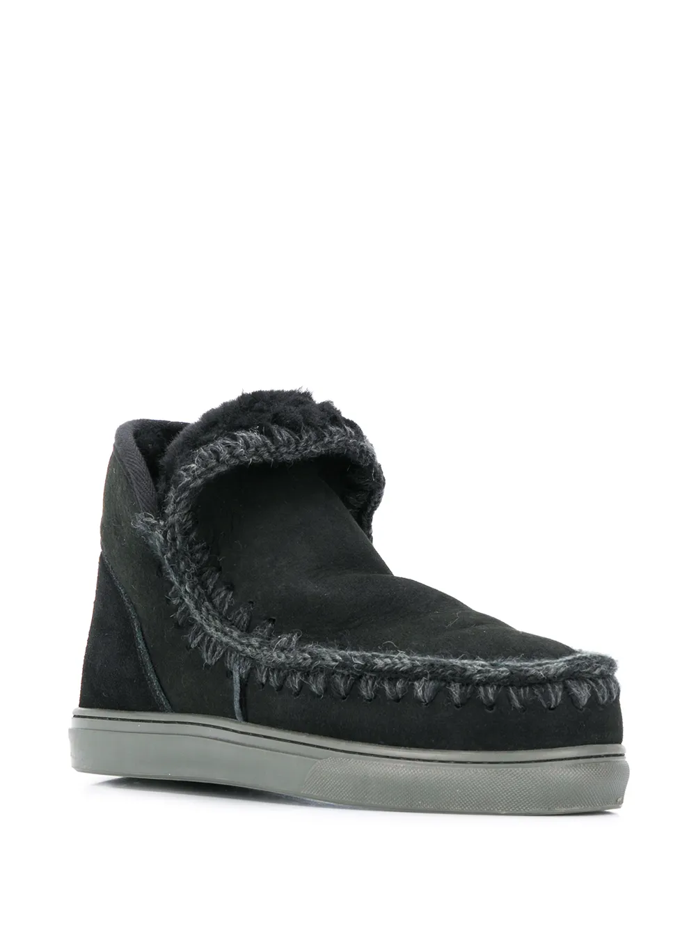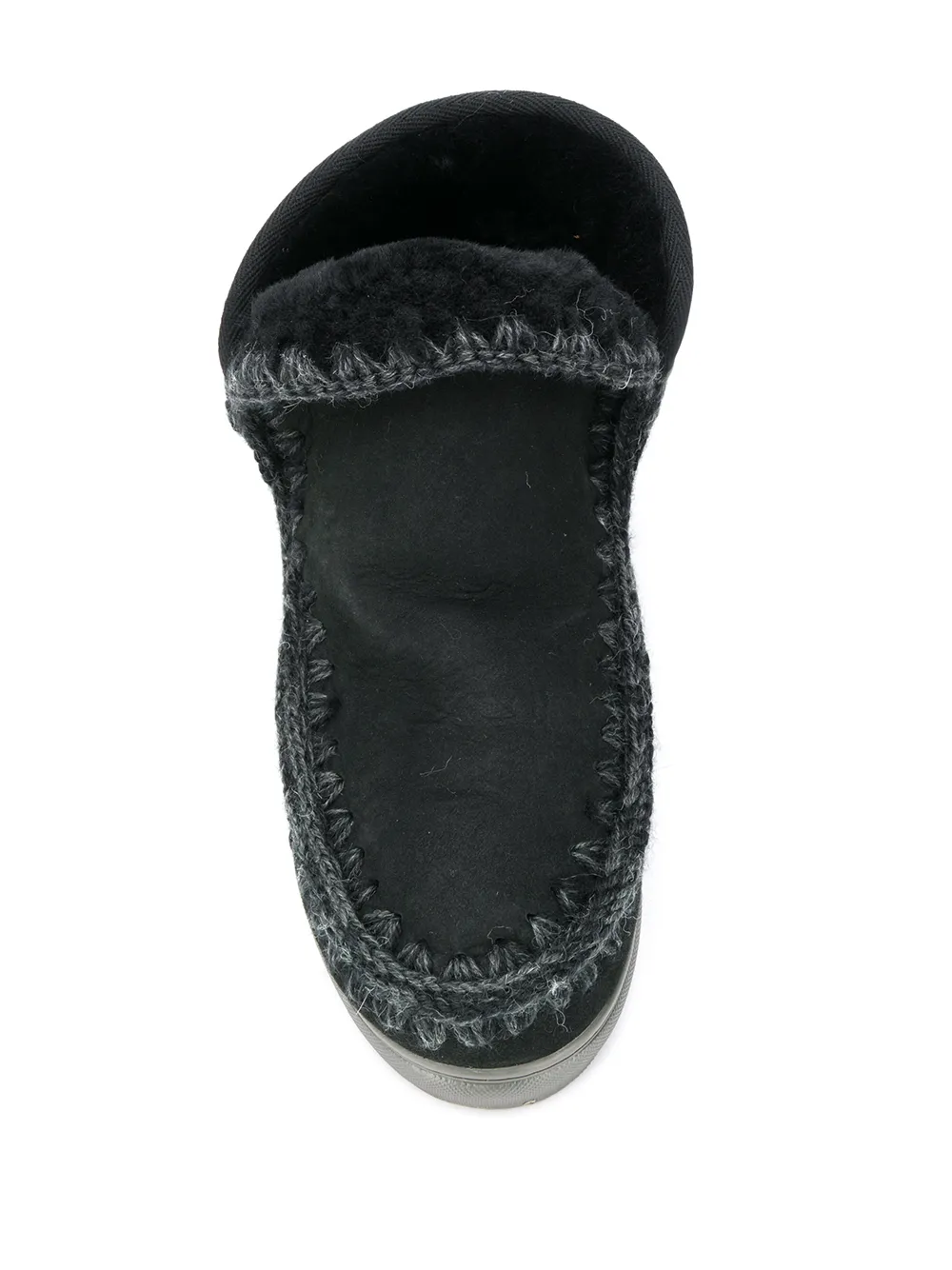 Плоская резиновая подошва, подкладка из овечьей шерсти, модель слип-он, без застежки и логотип сзади. Цвет: черный.