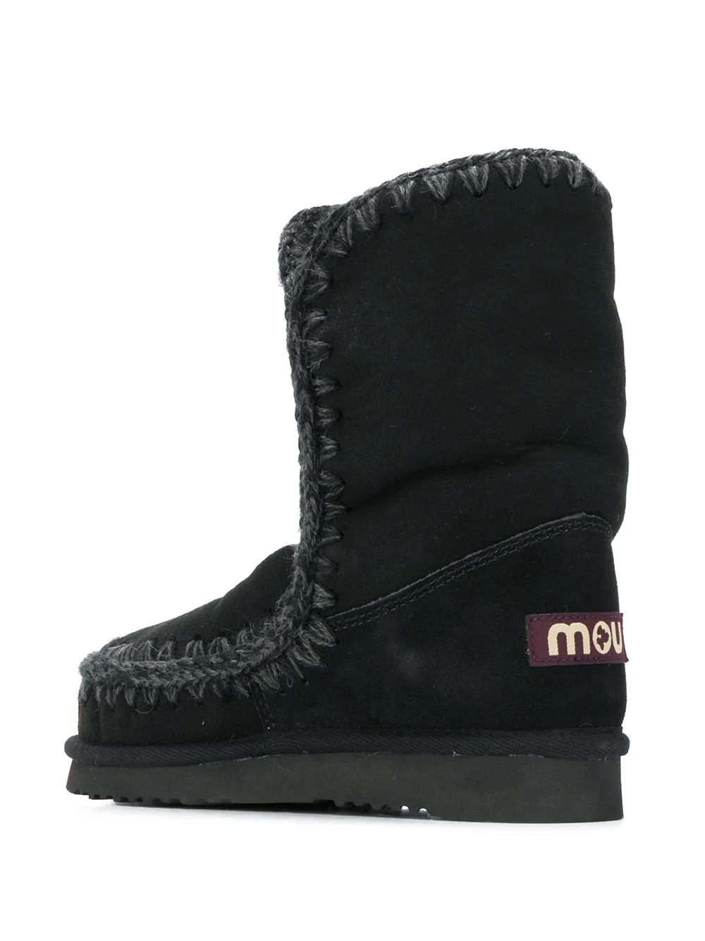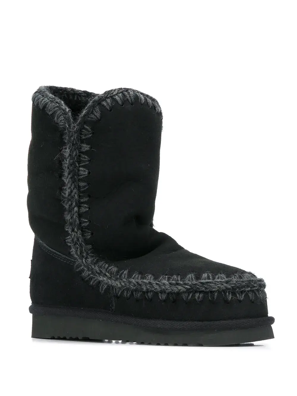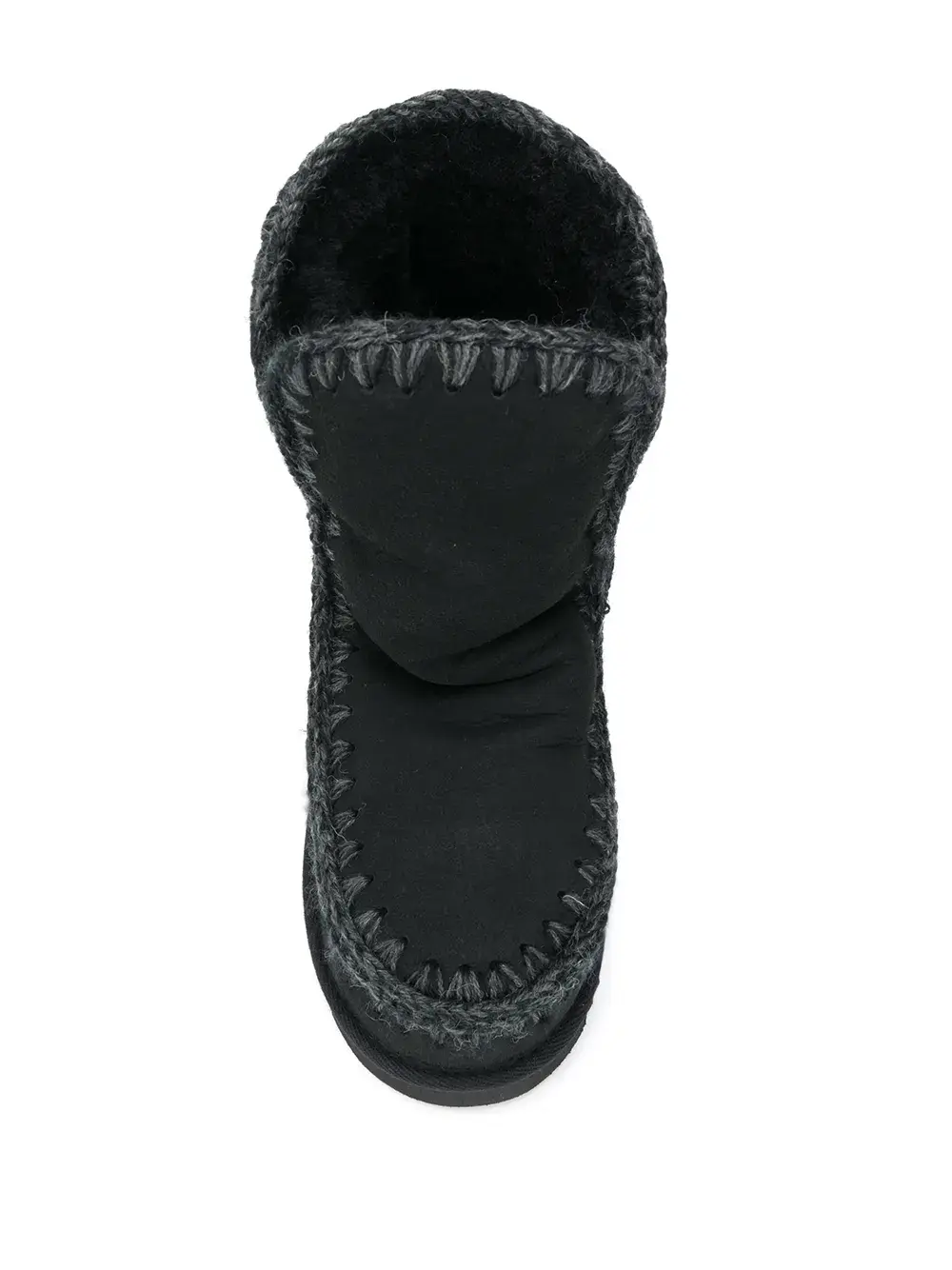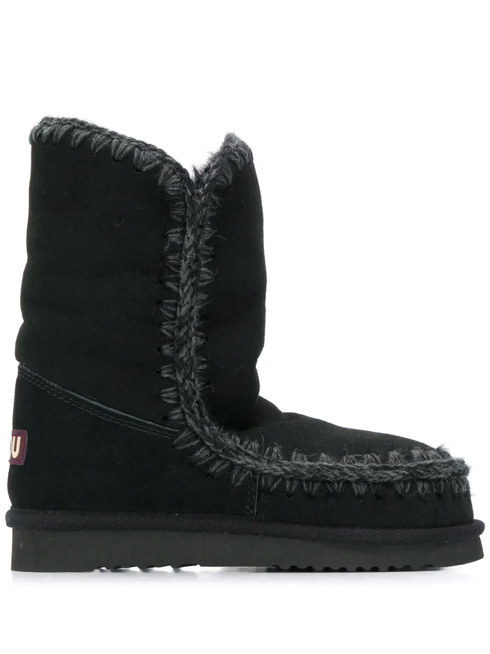 Черный, замша из телячьей кожи, овечья кожа, шерсть, строчка в тон, логотип, модель без застежки, закругленный носок и плоская резиновая подошва.