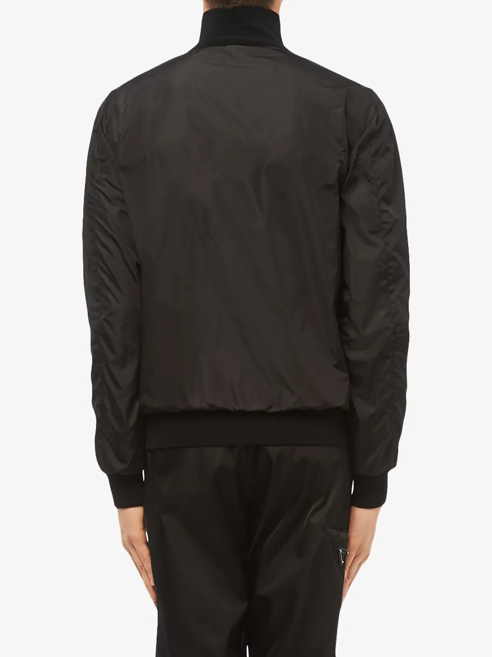 Двусторонний бомбер от Prada (Прада). Воротник с высокой стойкой, застежка на молнии спереди, длинные рукава, нагрудный карман, логотип на груди, передние карманы и подол и манжеты в рубчик. Цвет: черный.