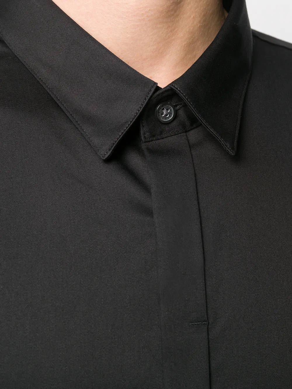 Рубашка на пуговицах от Armani Exchange. Классический воротник, потайная планка на пуговицах спереди, длинные рукава и закругленный подол. Цвет: черный.