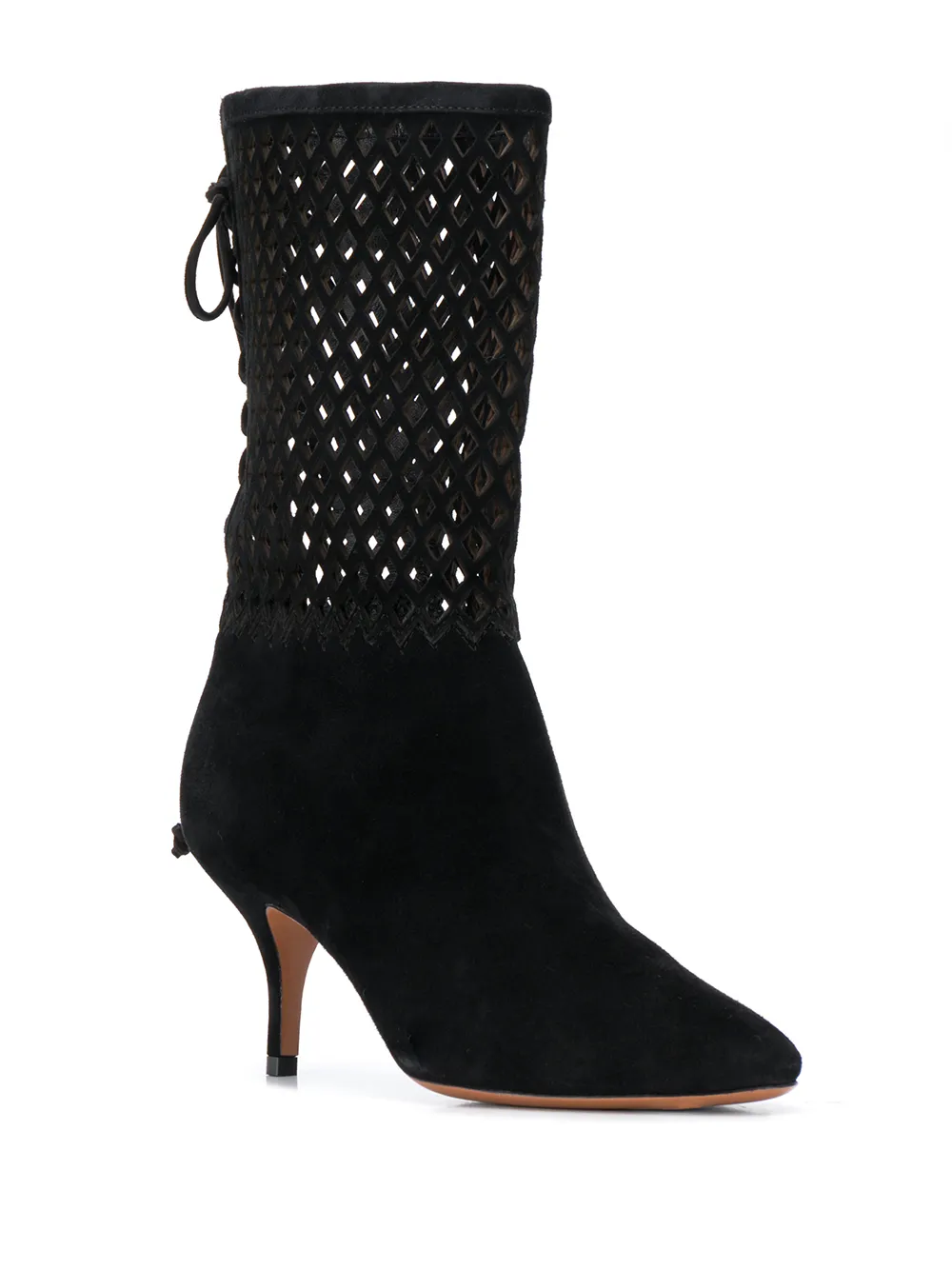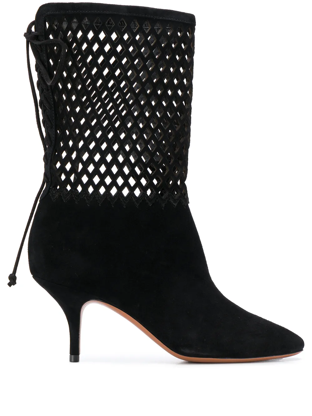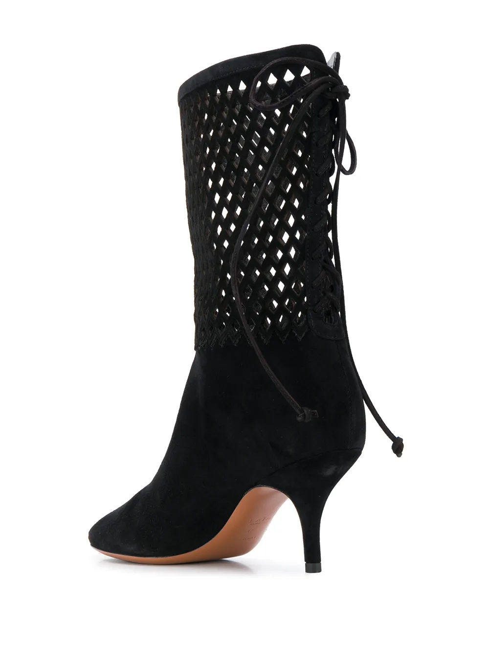 Ботильоны со вставками на каблуке-рюмка от Alaïa. Заостренный носок, перфорированная деталь, верх в сетку, застежка на завязке сзади, кожаная подошва и каблук конической формы. Цвет: черный.