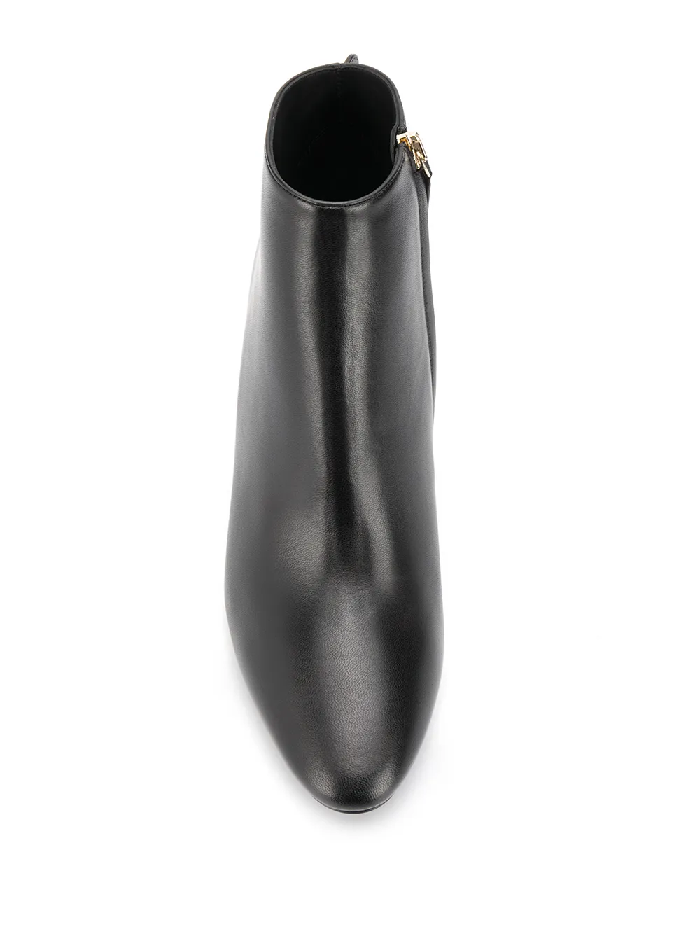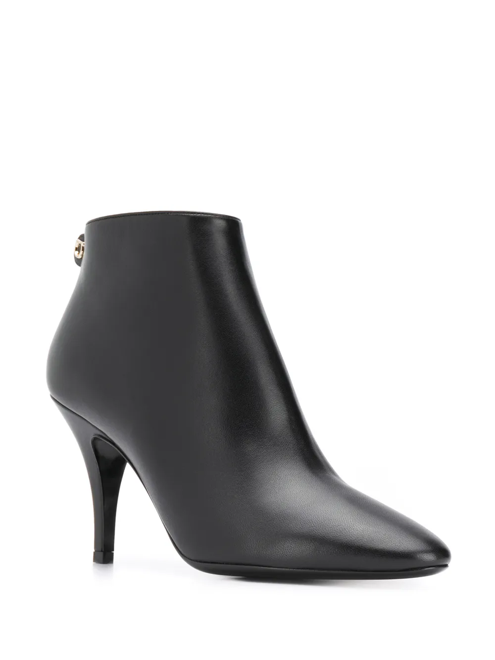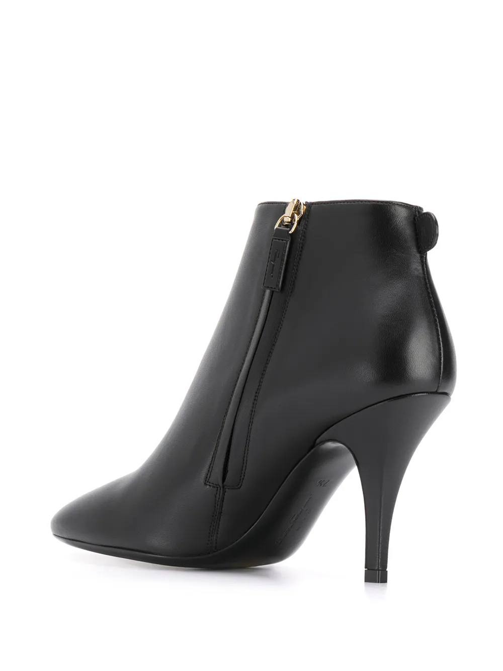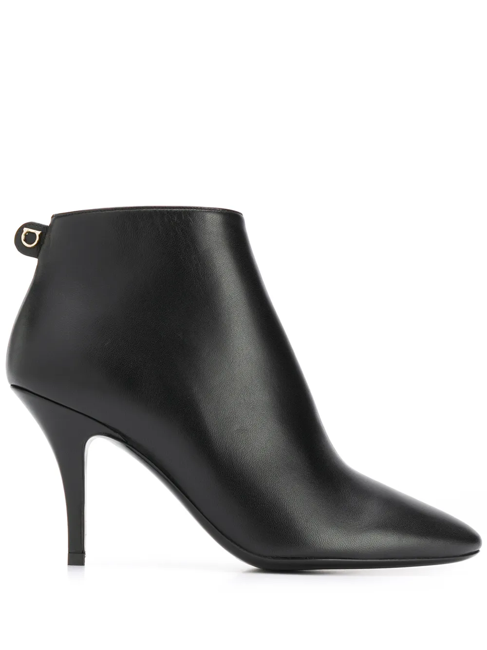 Ботильоны Joan от Salvatore Ferragamo (Сальваторе Феррагамо). Миндалевидный носок, высокая шпилька, петля для подтягивания сзади, фирменная деталь 'Gancini', застежка на молнии сбоку и кожаная подошва. Цвет: черный.