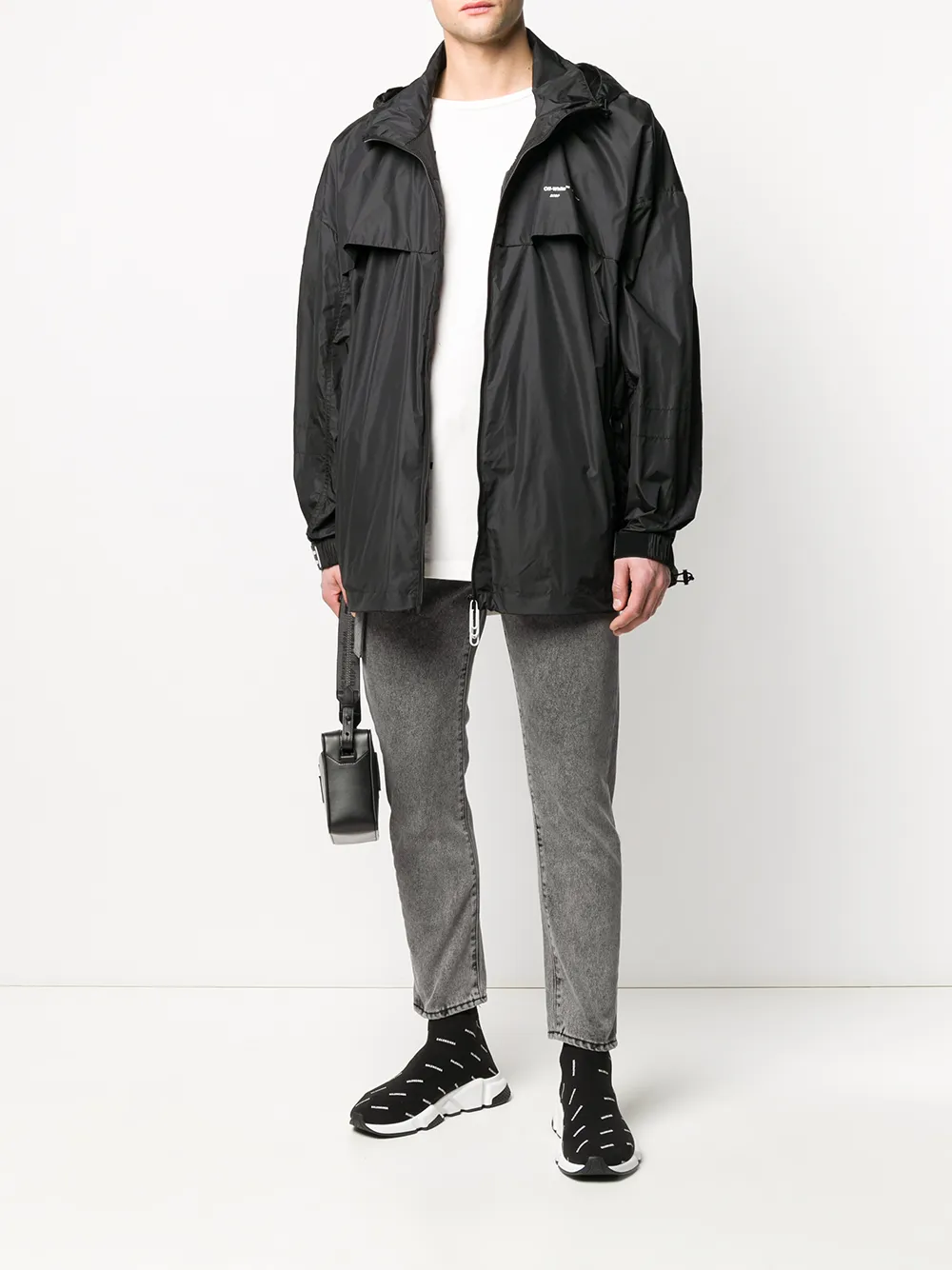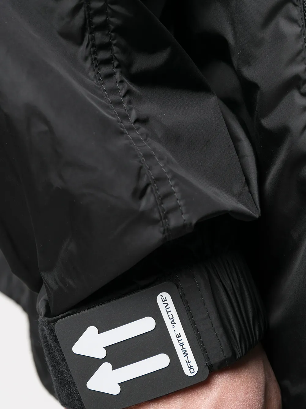 Легкая куртка с логотипом от Off-White. Капюшон, воротник-воронка, застежка на молнии спереди, принт с логотипом спереди, длинные рукава, эластичные манжеты, передние карманы на молнии и легкая конструкция. Цвет: черный.