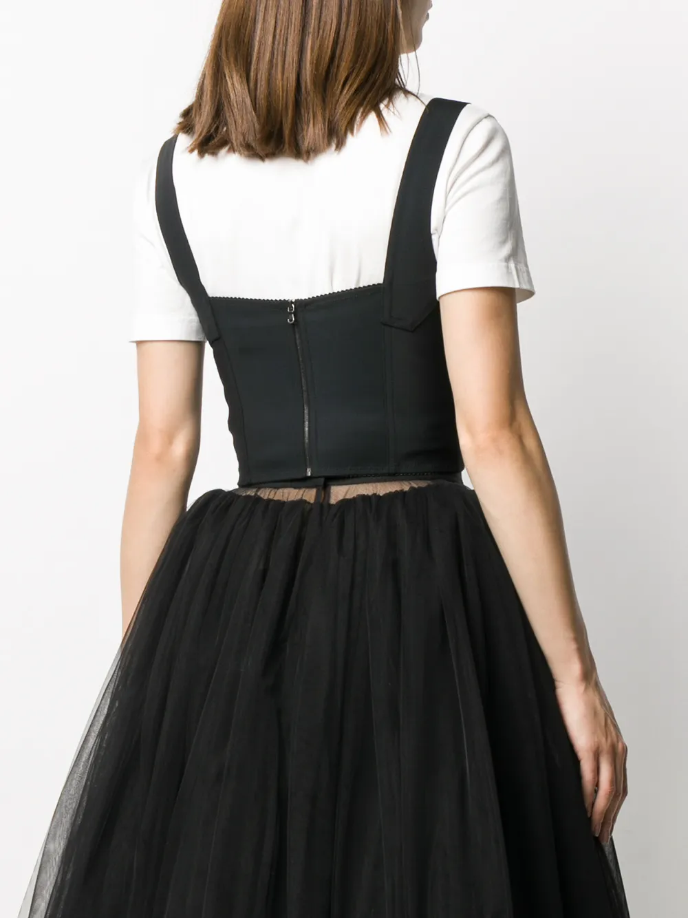 Каждый из нас заслуживает внимания. Обратить на себя все взгляды на предстоящей вечеринке поможет черный топ-бюстье с цветочным кружевом из коллекции Dolce & Gabbana (Дольче энд Габбана). Он имеет вырез в форме сердца, приталенный силуэт, открытую спину, застежку на молнии сзади и широкие лямки на плечи.