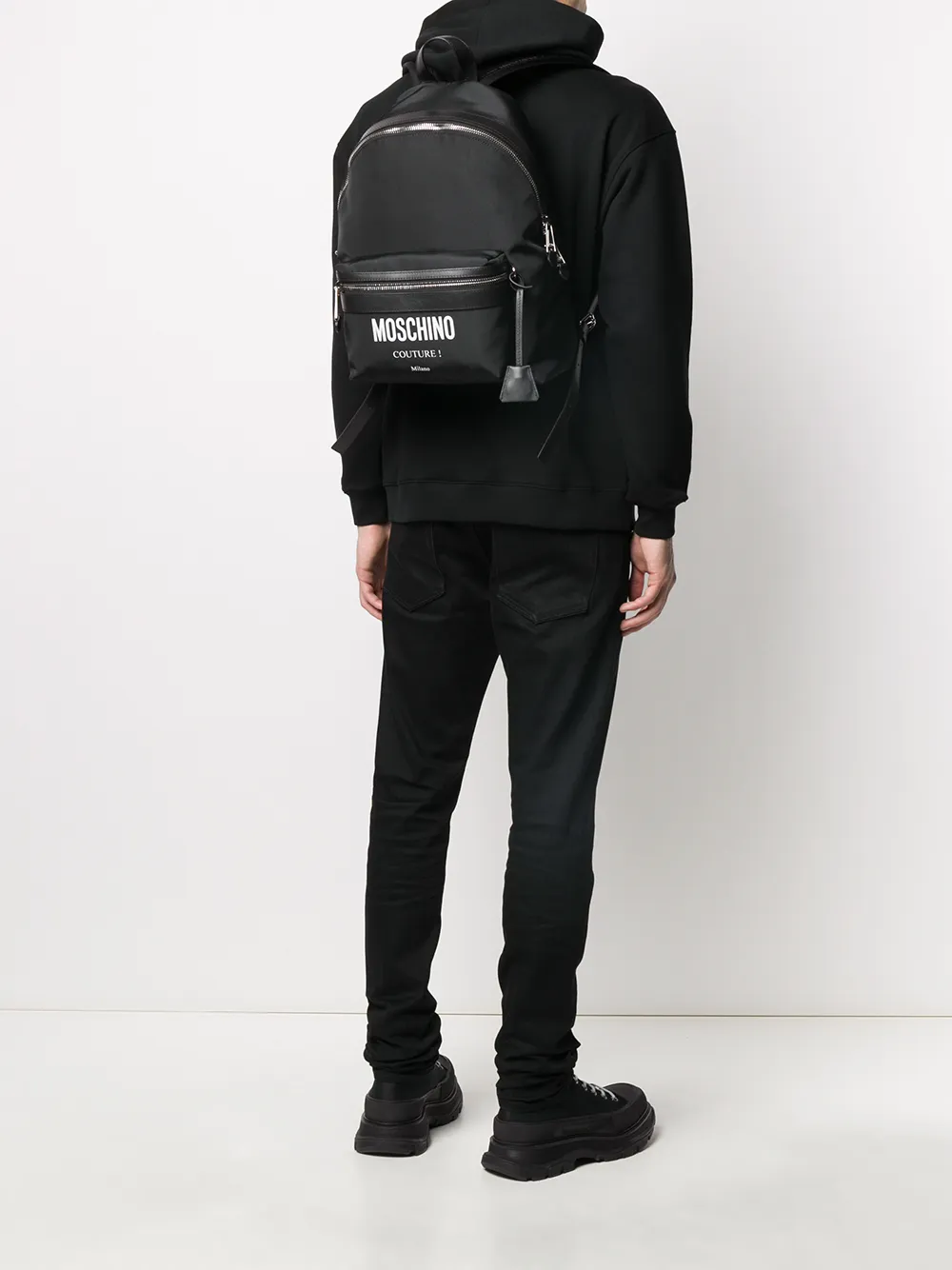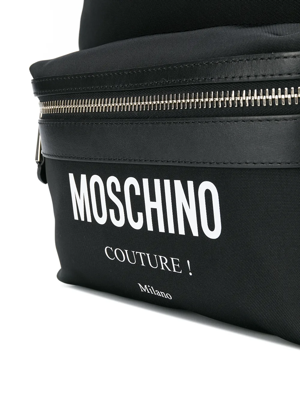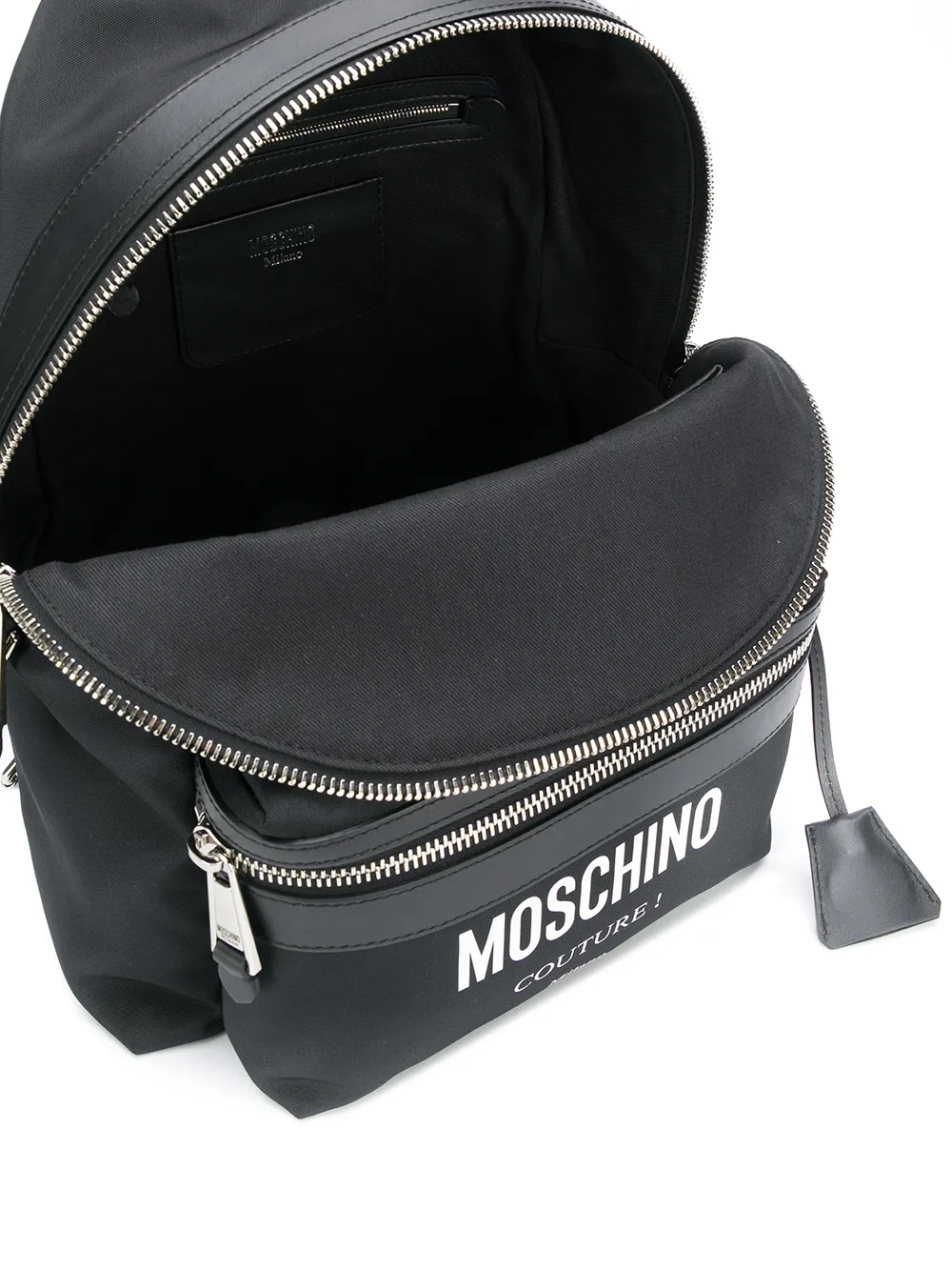 Рюкзак с логотипом от Moschino (Москино). Закругленная ручка, регулируемые лямки , двухсторонняя молния, принт с логотипом спереди, главный внутренний отдел, внутренний карман на молнии, внутреннее клеймо с логотипом, передний отдел на молнии, кожаный ярлык, кожаная отделка и серебристая фурнитура.