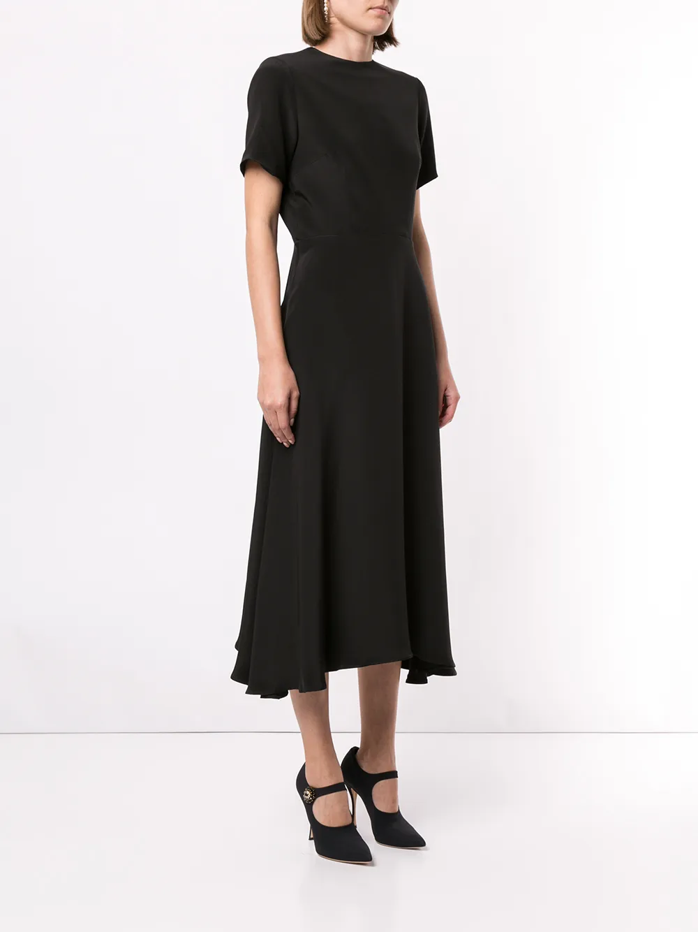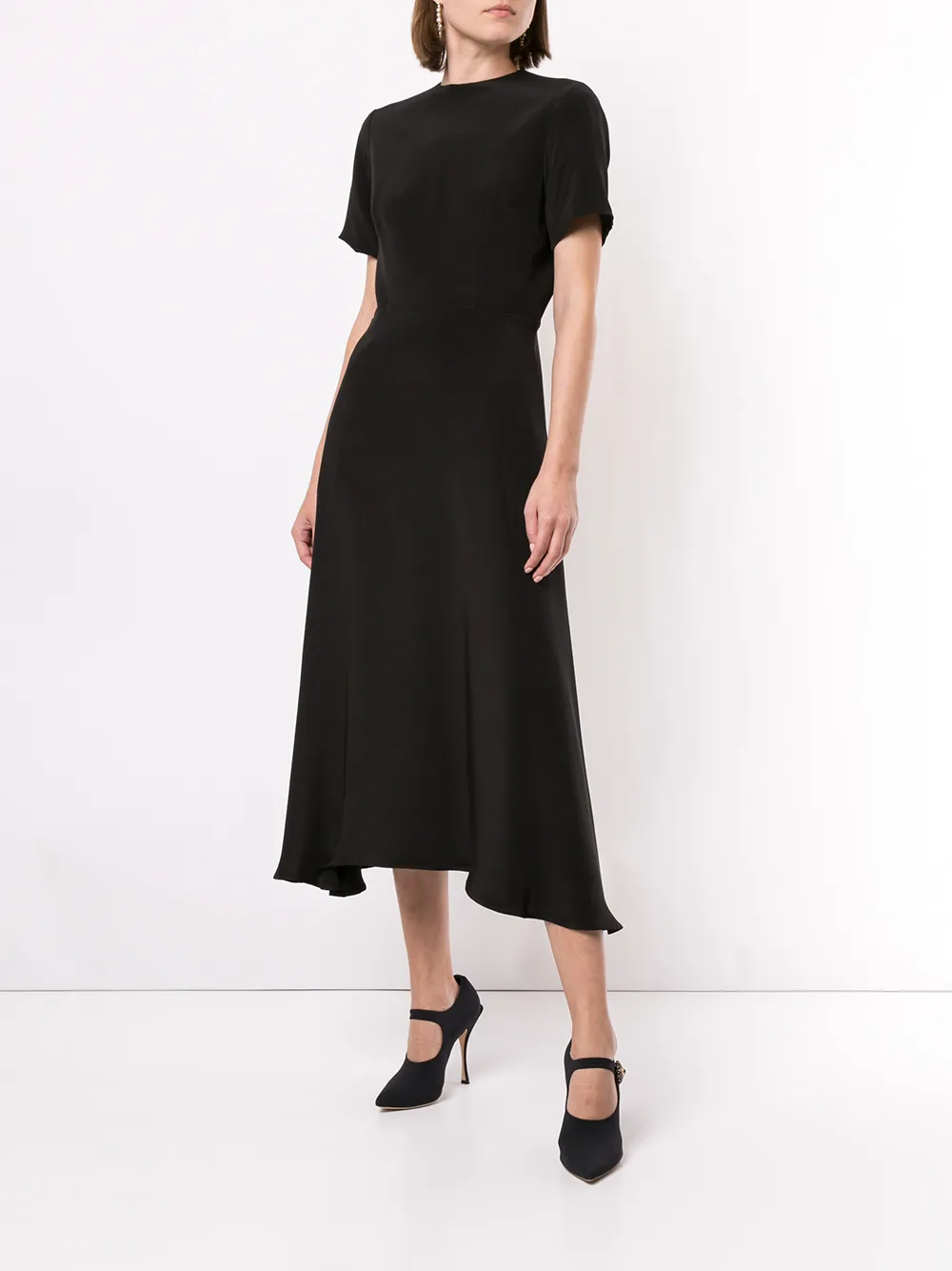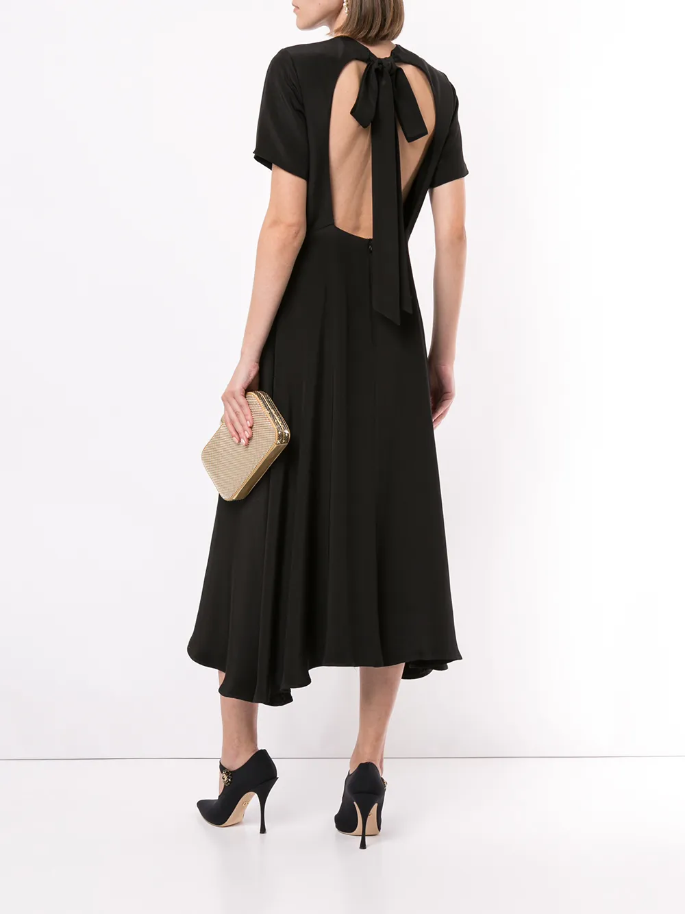 Платье миди с бантом от McGraw (МакГроу). Круглый вырез, короткие рукава, застежка на завязке сзади, асимметричный подол, потайная застежка на молнии сзади и средней длины. Цвет: черный.