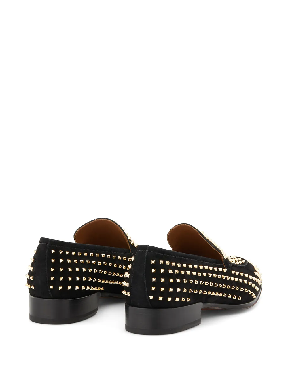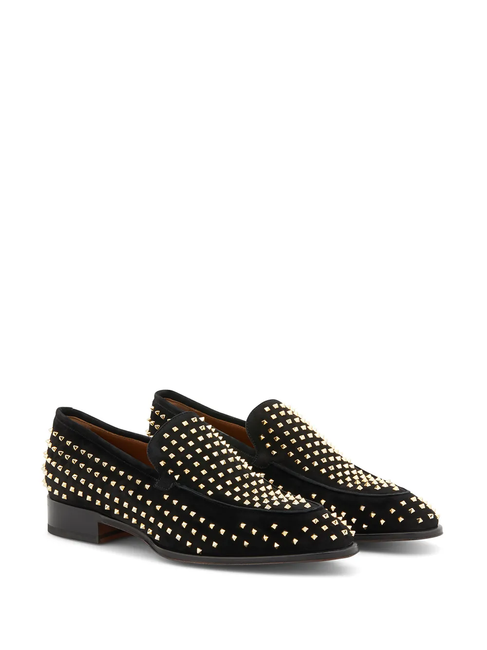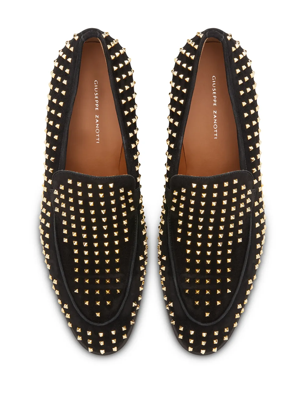 Лоферы с заклепками от Giuseppe Zanotti. Закругленный носок, модель слип-он, без застежки, фирменная стелька, наборный каблук и золотистые заклепки. Цвет: черный.