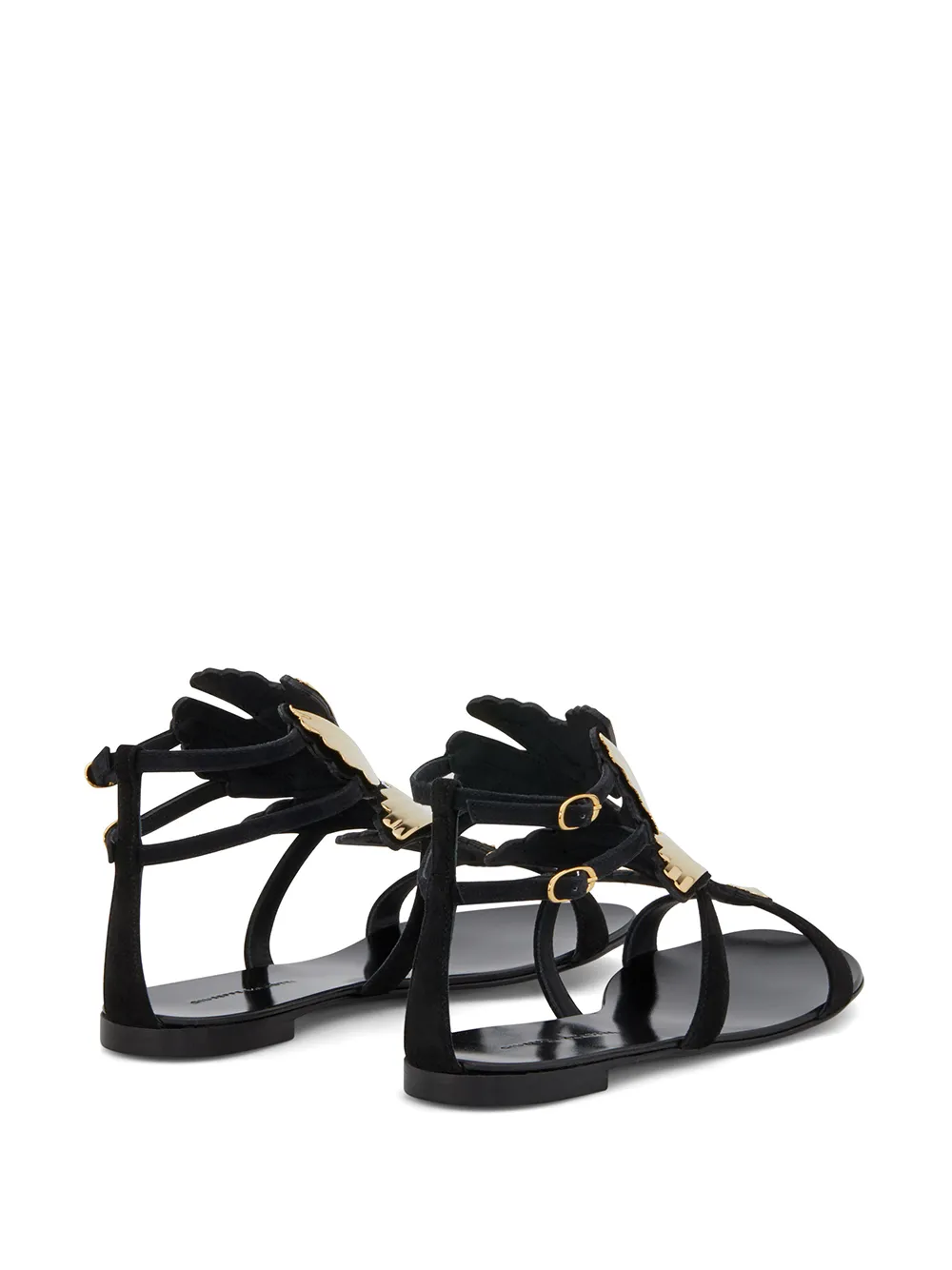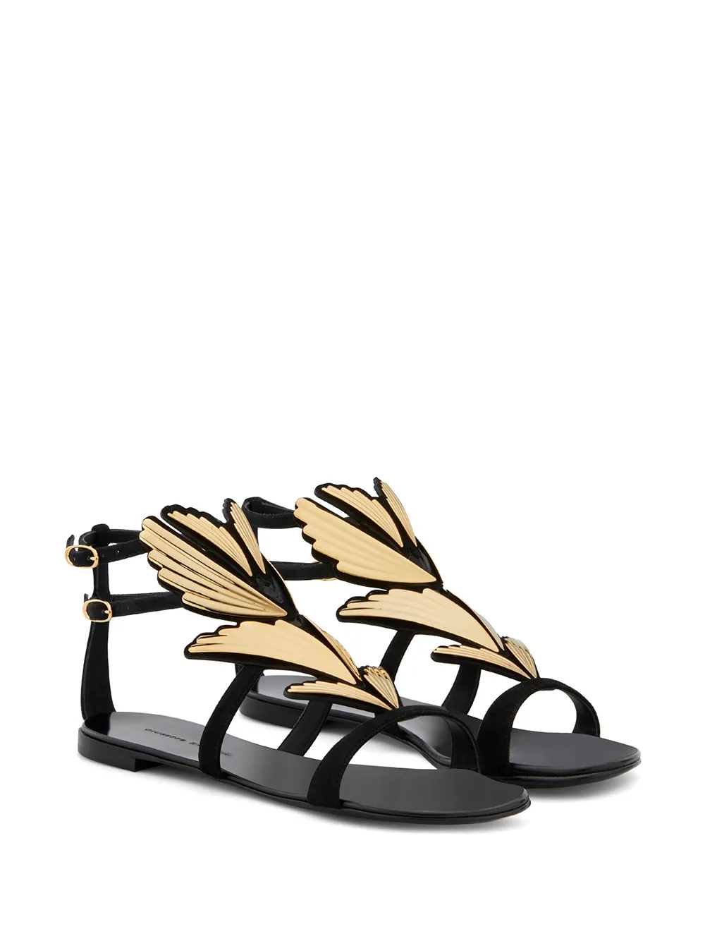 Сандалии 2.0 Cruel от Giuseppe Zanotti. Золотистая фурнитура, дизайн с ремешками, закругленный носок, застежки по бокам на пряжке, фирменная стелька и плоская подошва. Цвет: черный.