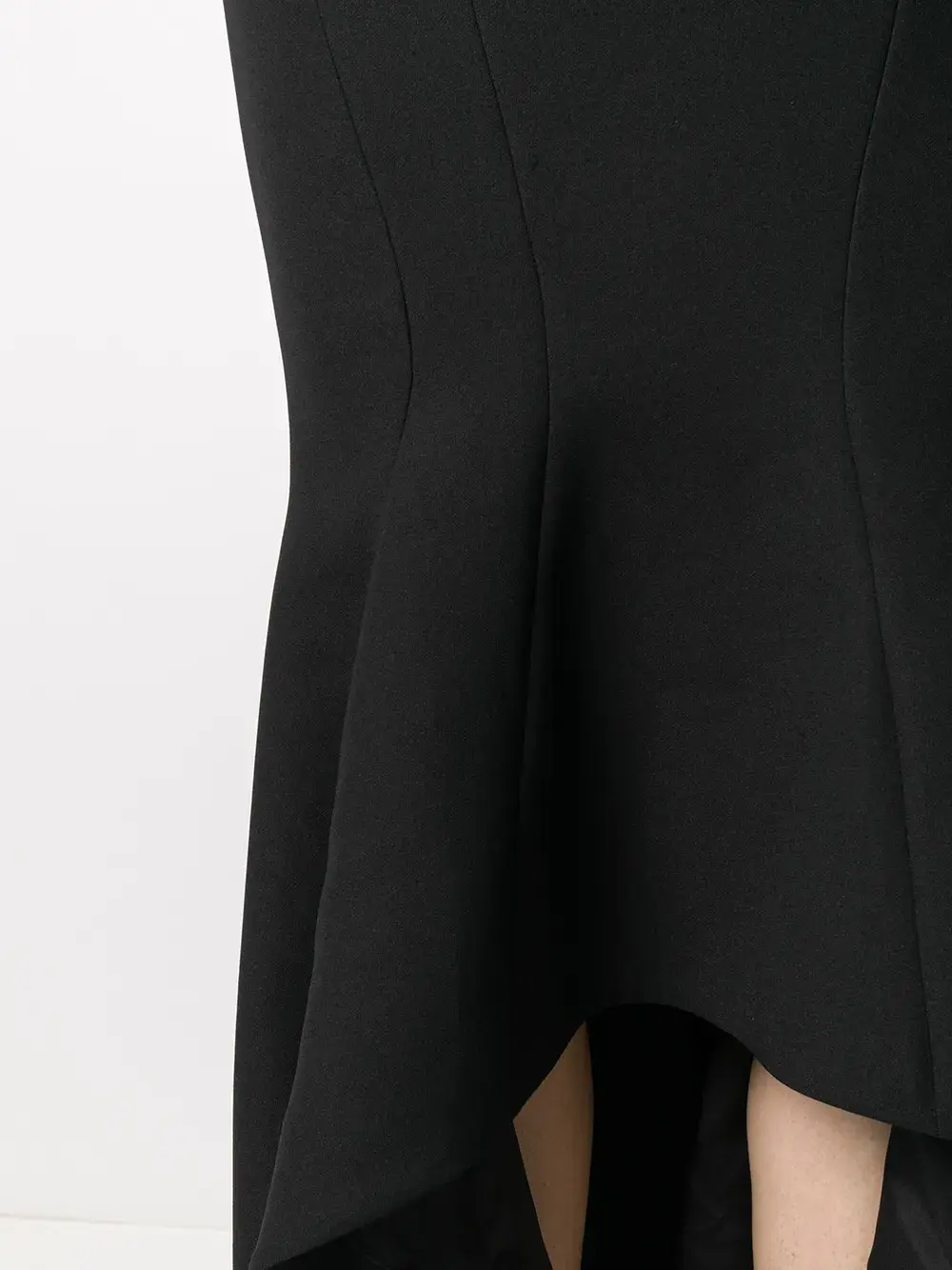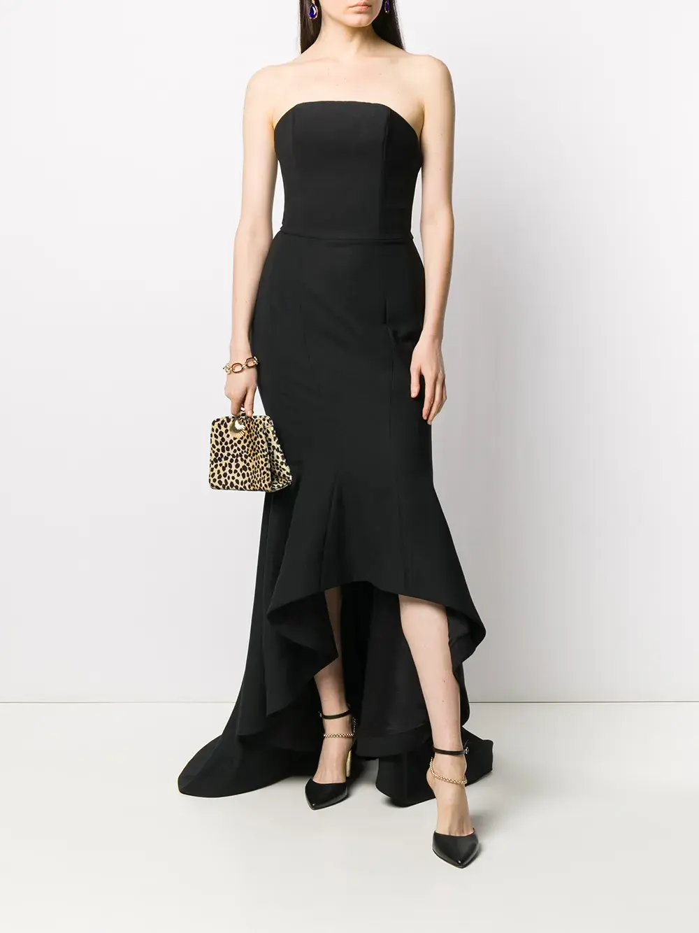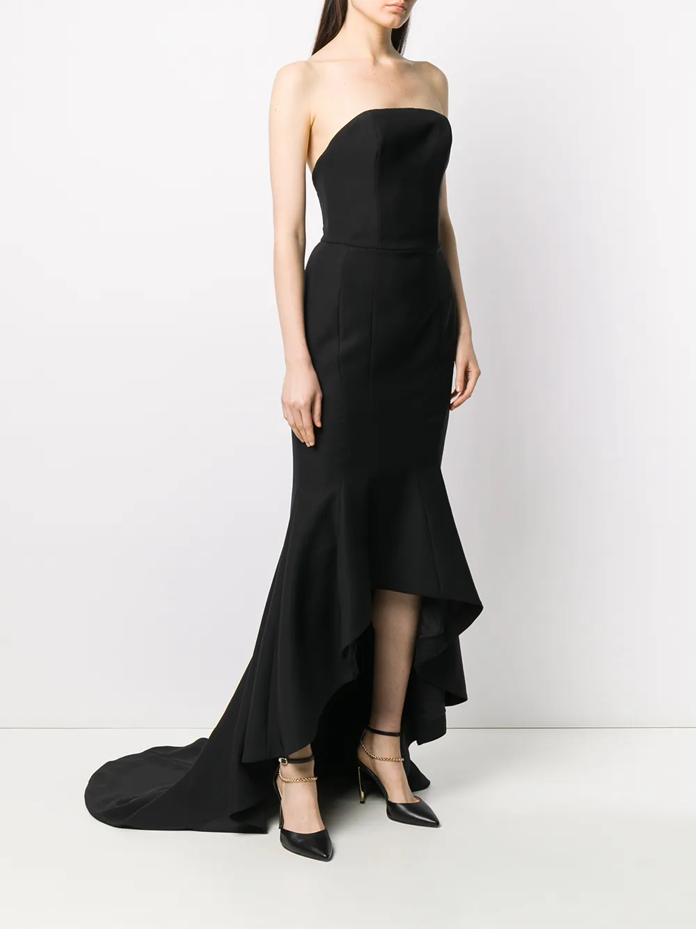 Вечернее платье без бретелей от Alexandre Vauthier. Потайная застежка на молнии, приталенный силуэт, асимметричный подол и удлиненная модель. Цвет: черный.
